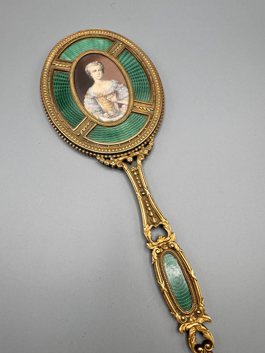 Antique 1900 French Guilloché Enamel Hand Mirror Portrait Miniature 11.75”