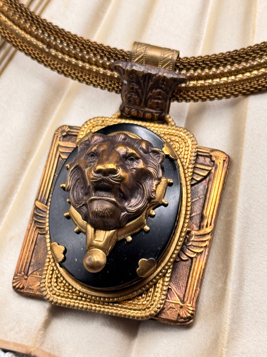 Egyptian Revival Lion Necklace Mesh Collar Statement Pendant 16.75”