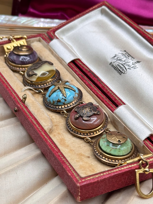 Vintage Gold-tone Bracelet Nautical Sea Life Cabochon Link Turtle Seahorse 6.5”