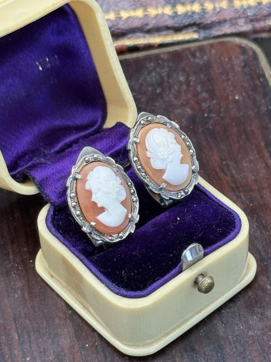 Antique Style Cameo Earrings 800 Silver Marcasite Clip-on ESTATE FIND