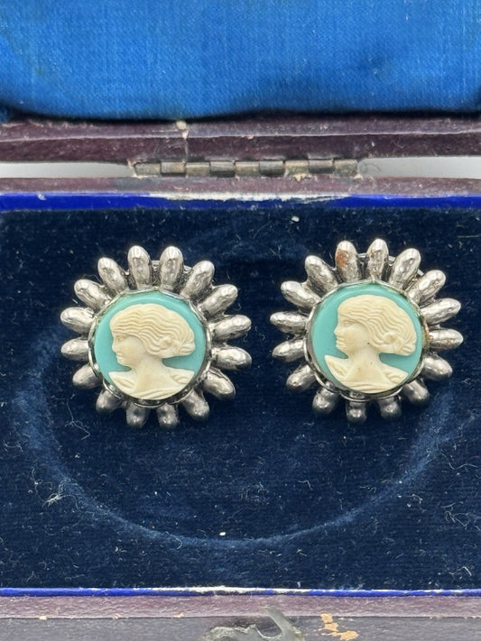 Vintage Faux Cameo Earrings Turquoise Silvertone Clip-on ESTATE FIND