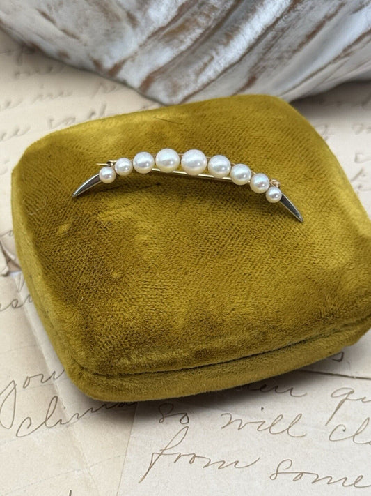Vintage 14k Gold Pearl Crescent Moon Brooch Graduated 9 Pearls