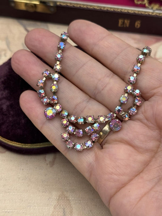 Vintage Pink Necklace Aurora Borealis Rhinestone Crystal Choker Hook 17” x .75”
