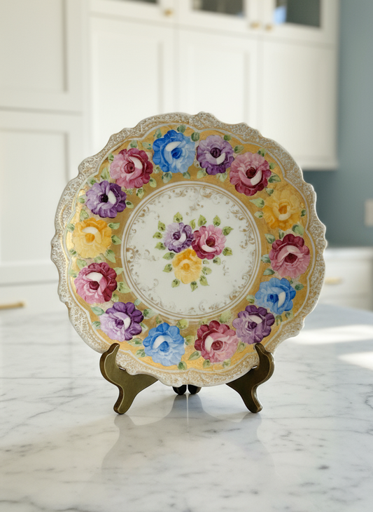 Large Vintage Floral Gold Porcelain Platter Ca. 12.25”d ESTATE FIND