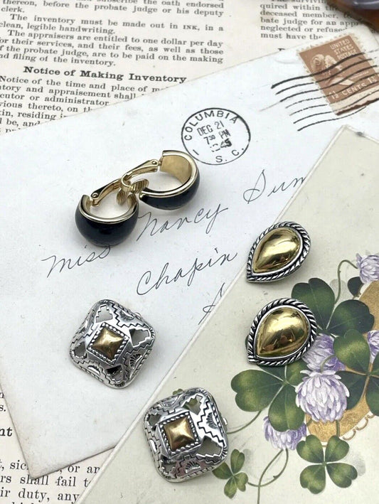 Vintage Earring Set Of 3 Pairs Gold Tone Silver Tone Black Enamel