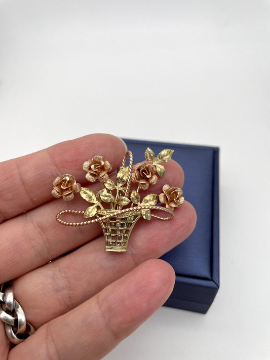 Vintage Signed Krementz Flower Basket Brooch Goldtone & Rose Goldtone