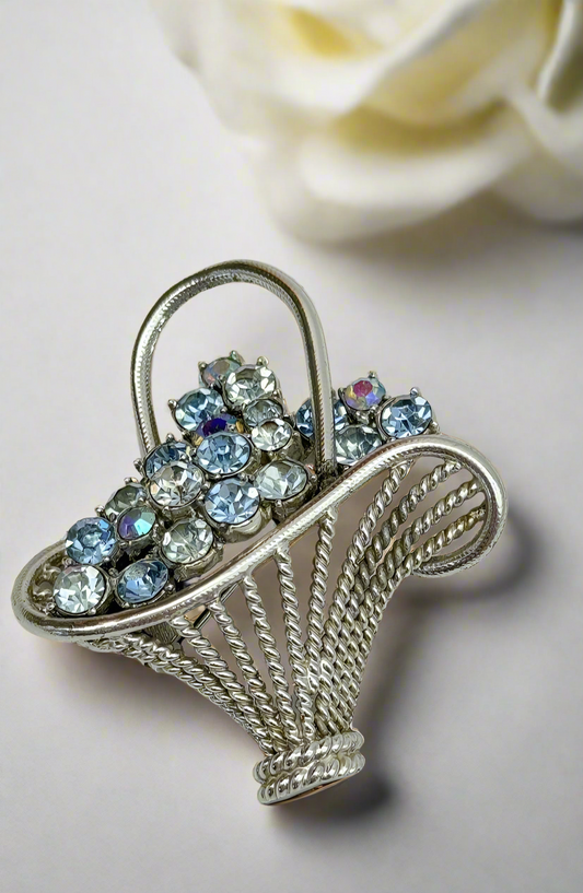 Rhinestone Brooch Coro Signed Ice Blue AB Flower Basket Rhodium Plated VINTAGE