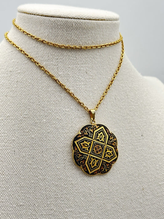 Vintage Damascene Black Goldtone Pendant Necklace 23”l