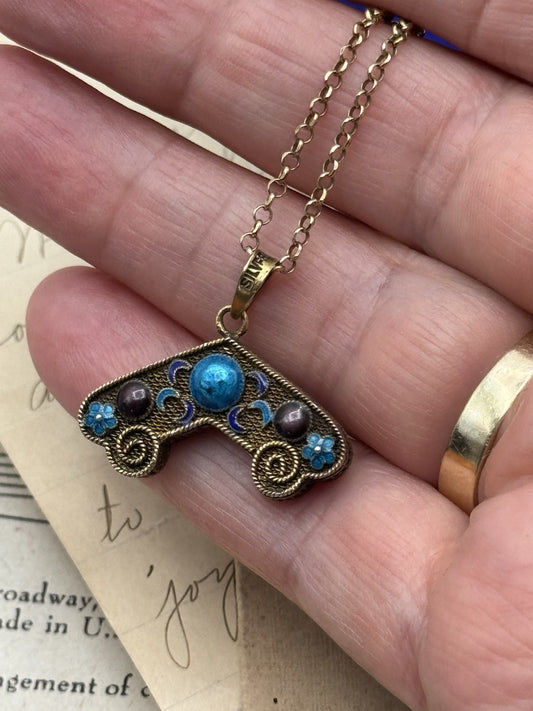 Silver Enameled Antique Gold Tone Charm 925 Gold Plated Necklace 18” Chain