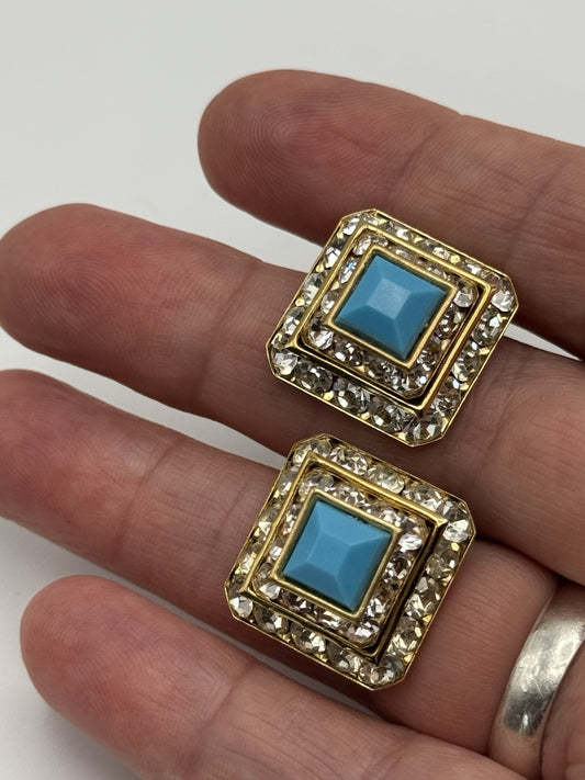 Vintage EARRINGS Goldtone Rhinestone And Blue Center Acrylic Stone ESTATE FIND