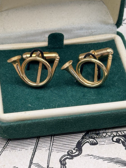 Vintage French Horn Cufflinks Goldtone EQUESTRIAN Hunting Horn In Original Case