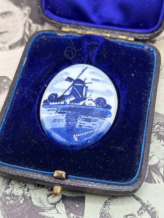 Vintage Delft Style Porcelain Brooch Windmill Landscape Scene