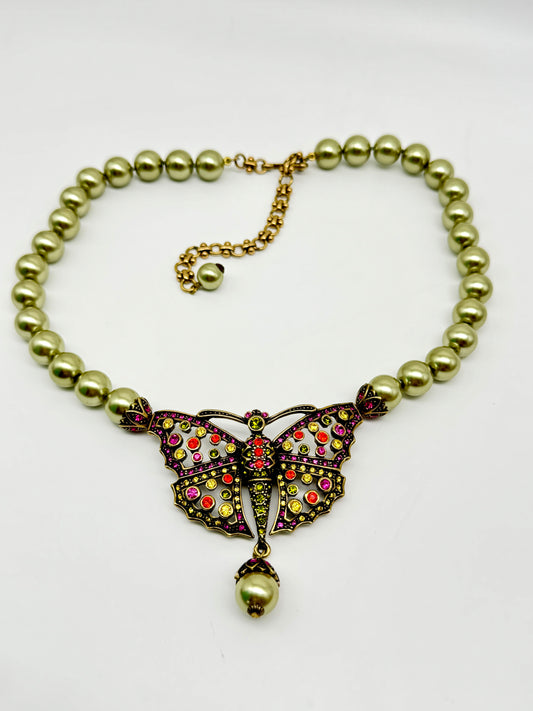 HEIDI DAUS Butterfly Crystals Green FAUX Pearls Necklace Estate Find BEAUTIFUL