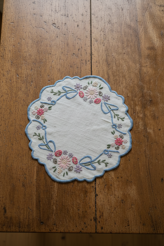 Vintage Hand Embroidered Doily Floral Blue Ribbon Bows Scalloped Edge 10.25”