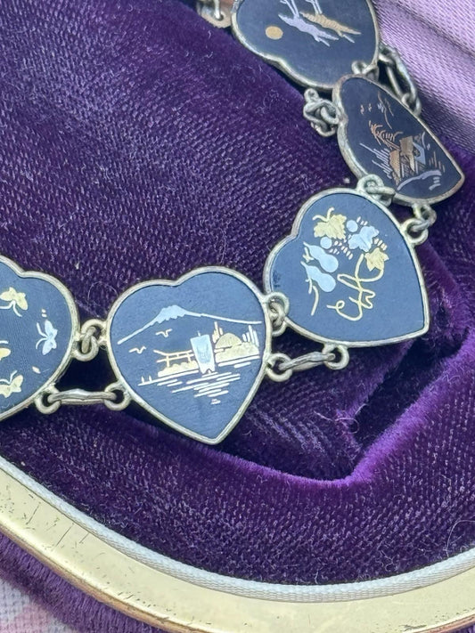 Vintage Japanese Damascene Bracelet Heart Panels Goldtone Black Inlay 7.25”