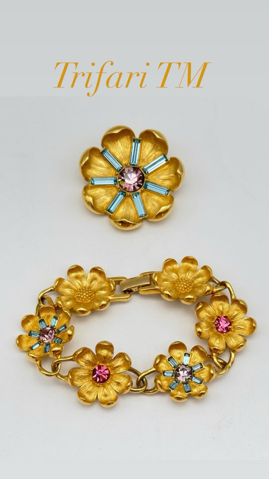 Vintage SIGNED TRIFARI TM Demi Parure Crystal Blue Purple Pink Brooch Bracelet 6.25”-6.5”