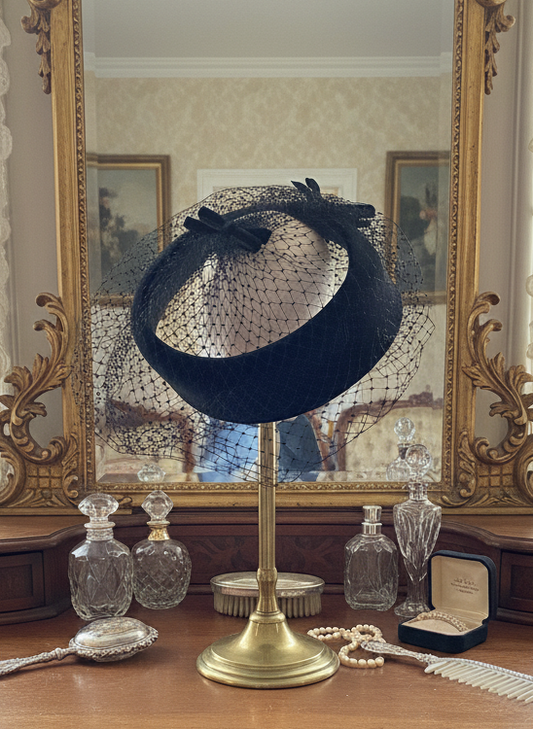 Vintage Black Satin Velvet Bow Veil HAT FACINATOR Open Crown 7” Hat Rim