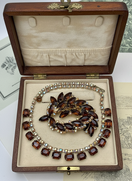 Juliana Style Whiskey Rhinestone Necklace & Brooch Set Aurora Borealis Accents