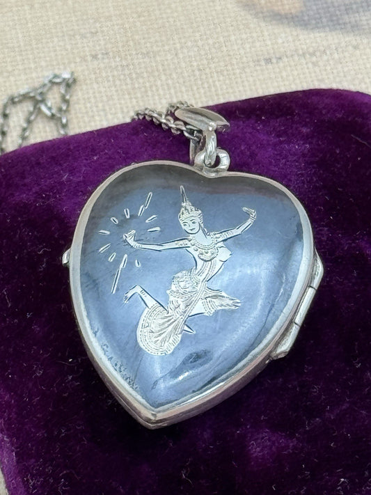 Sterling Siam Heart Locket Niello Vintage Thai Dancer Necklace 16” ESTATE FIND