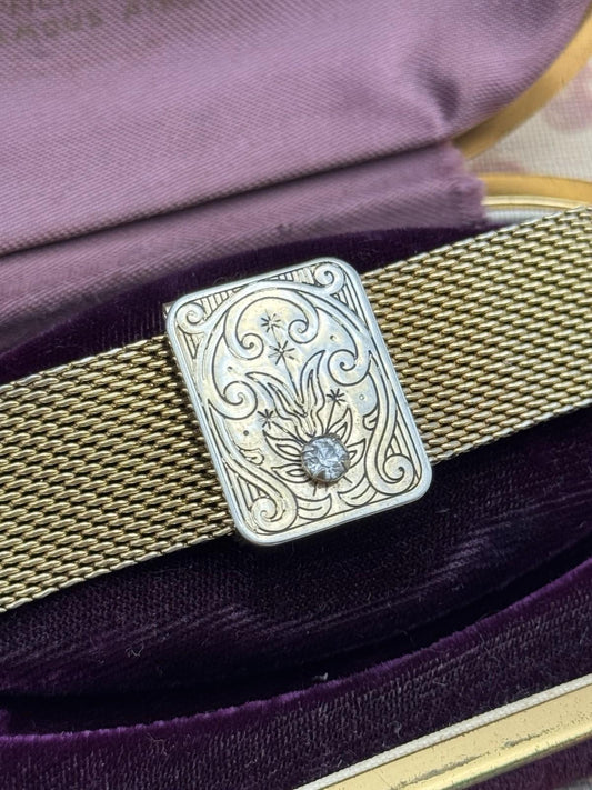 Vintage 1950s Gold Filled Mesh Bracelet w/ Engraved Clasp & Rhinestone