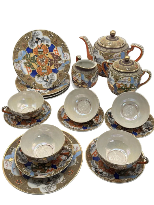 Moriage Tea Set 18 Pc Hand Painted Japan Geisha Lithophane Teapot Sugar Creamer