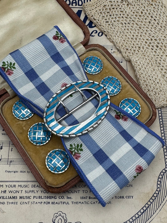 Antique 1907 Sterling Silver & Cerulean Blue Guilloché Enamel Buckle and 6 Button Set – Levi & Salaman, Birmingham in Original Case