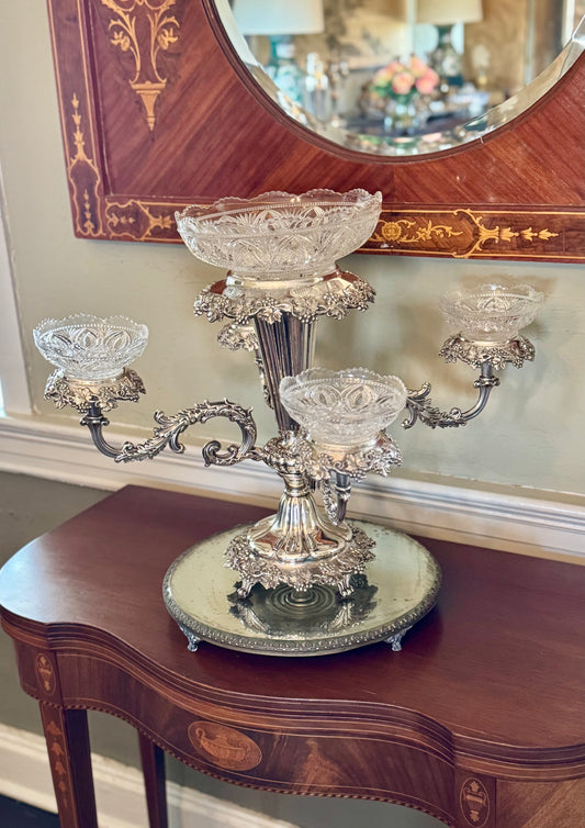 19th Century EPERGNE 4 Arm Silver Plate on Copper Rotates with Berry Bowl Set circa 16”h x 23”w