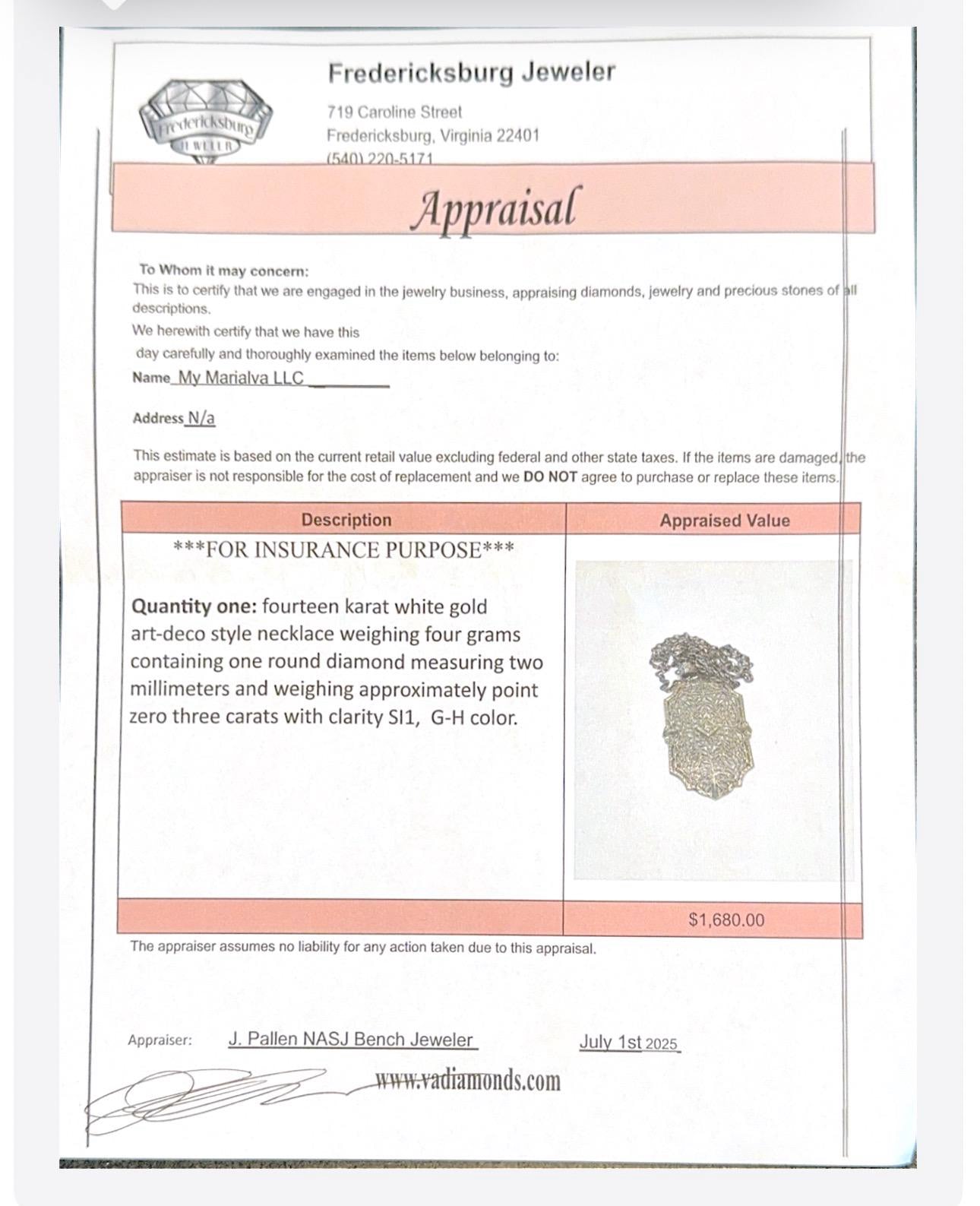 14K White Gold Art Deco Style Diamond Pendant Necklace – Appraisal Conveys with Purchase