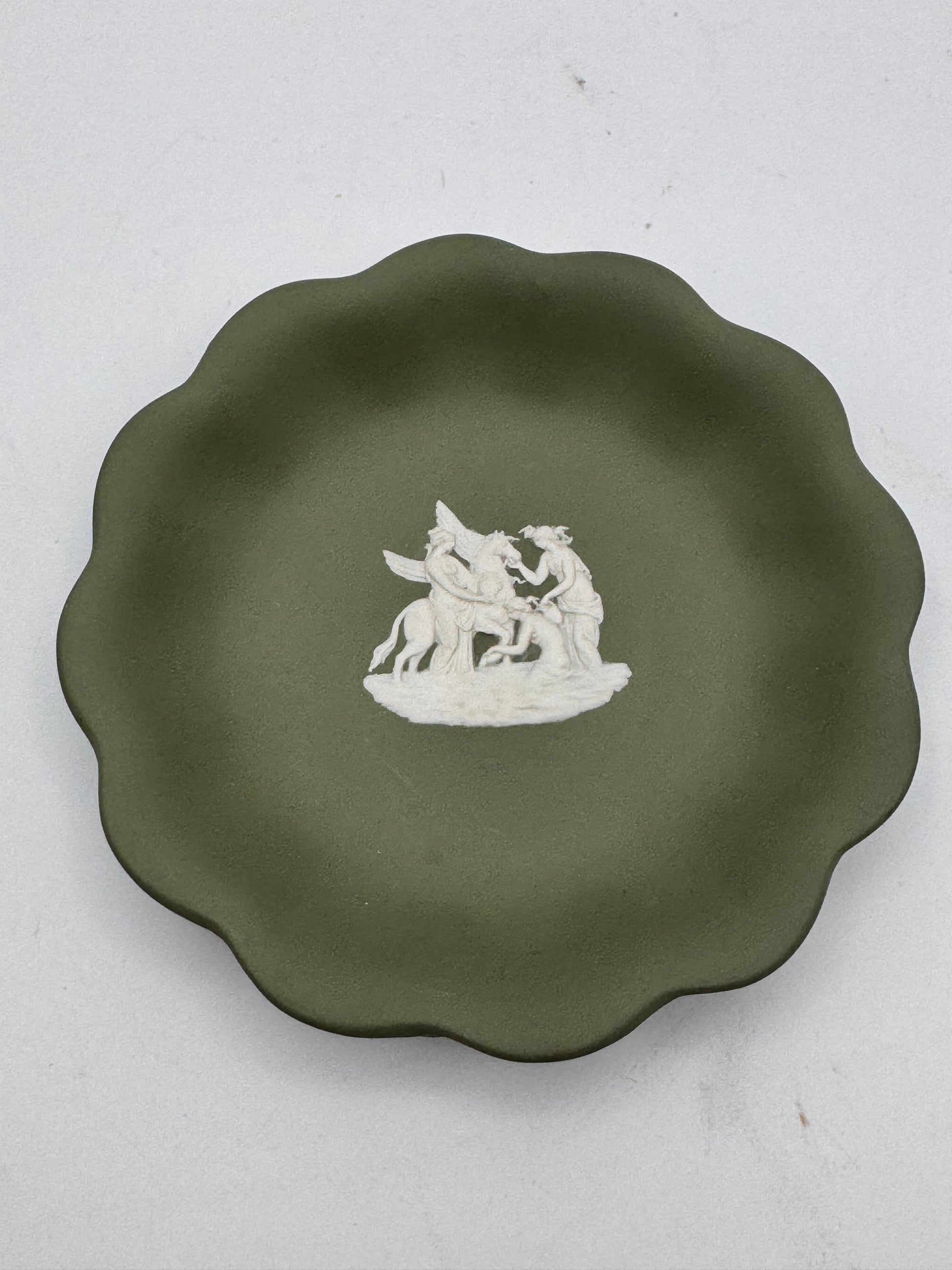 A striking mid-century Wedgwood Jasperware dish in a rich olive green, produced in 1955 and featuring a beautifully sculpted classical mythological scene in crisp white relief. The figural group — Pegasus and classical figures — is one of Wedgwood’s most admired jasper reliefs, inspired by ancient Greco-Roman sculpture.