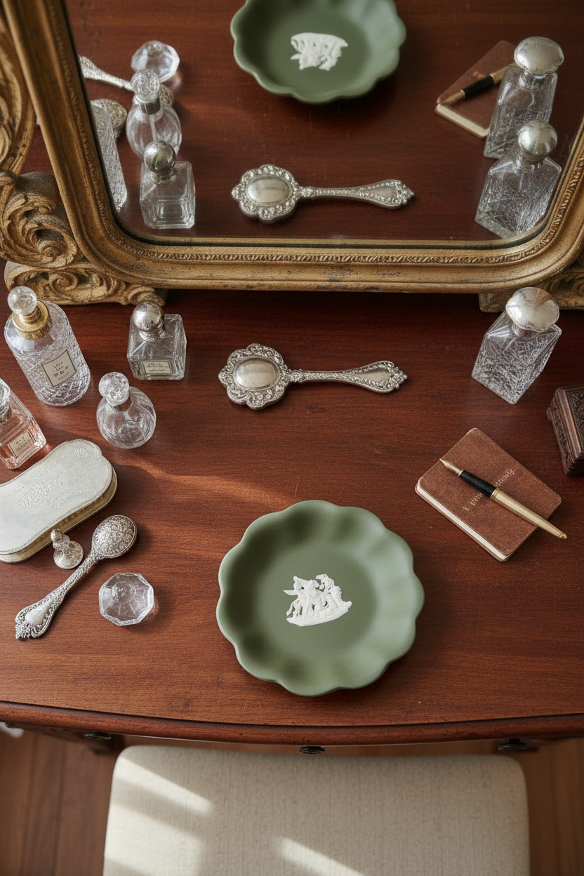 This shallow round dish is the perfect size for rings, cufflinks, desk treasures, or to sit layered into a china cabinet or library shelf. The scalloped edge gives it that refined, tailored English look that collectors love.