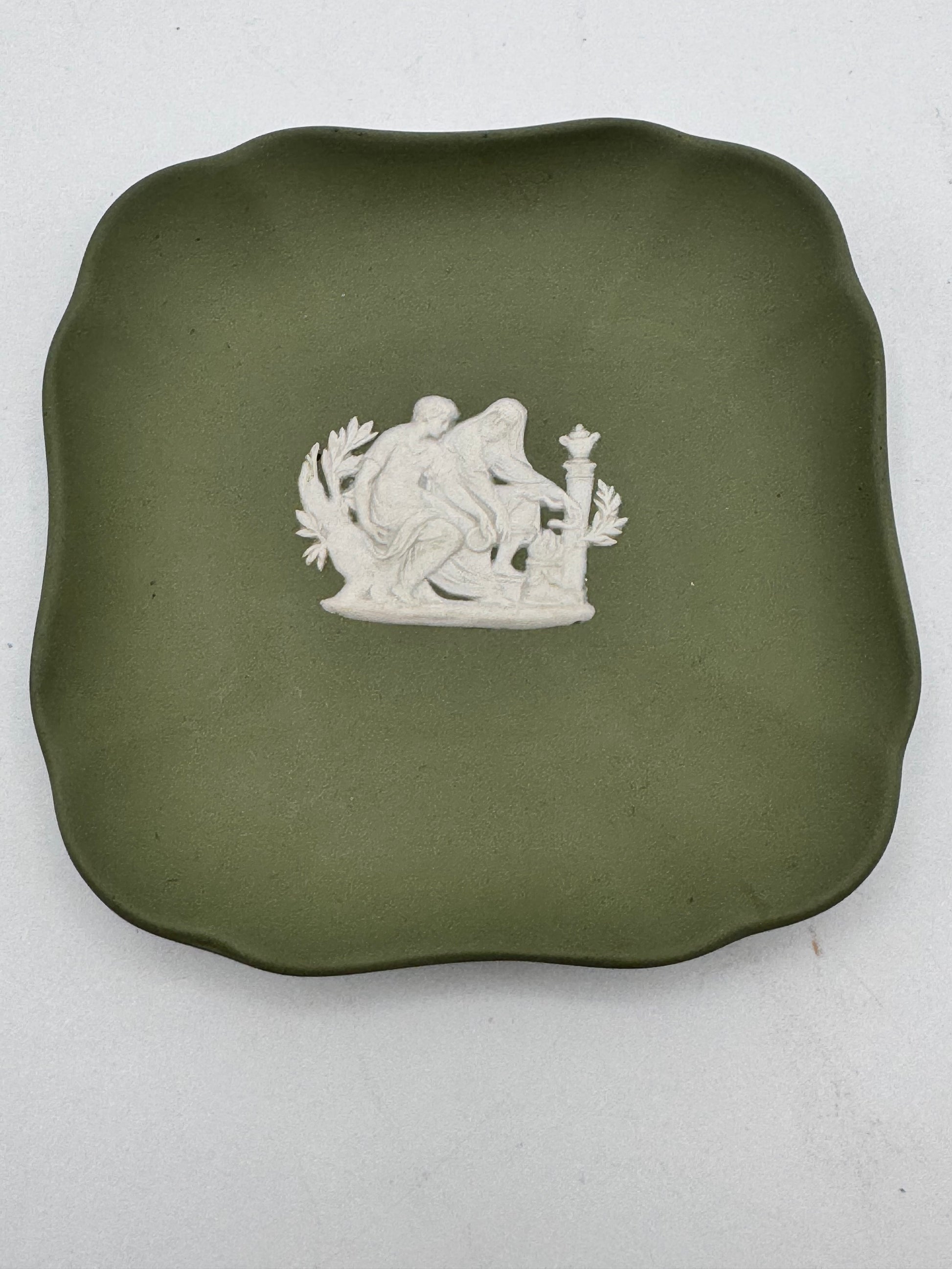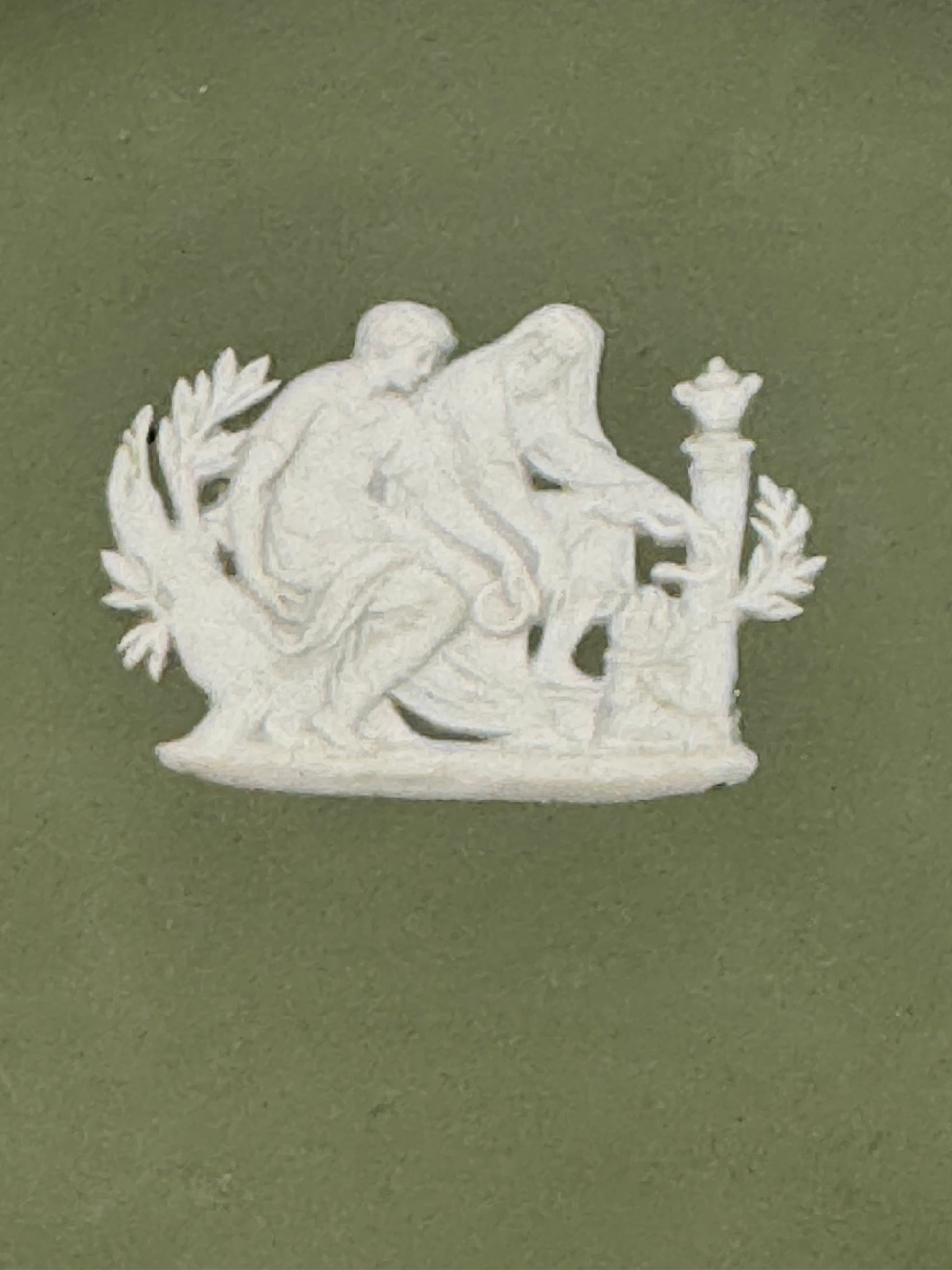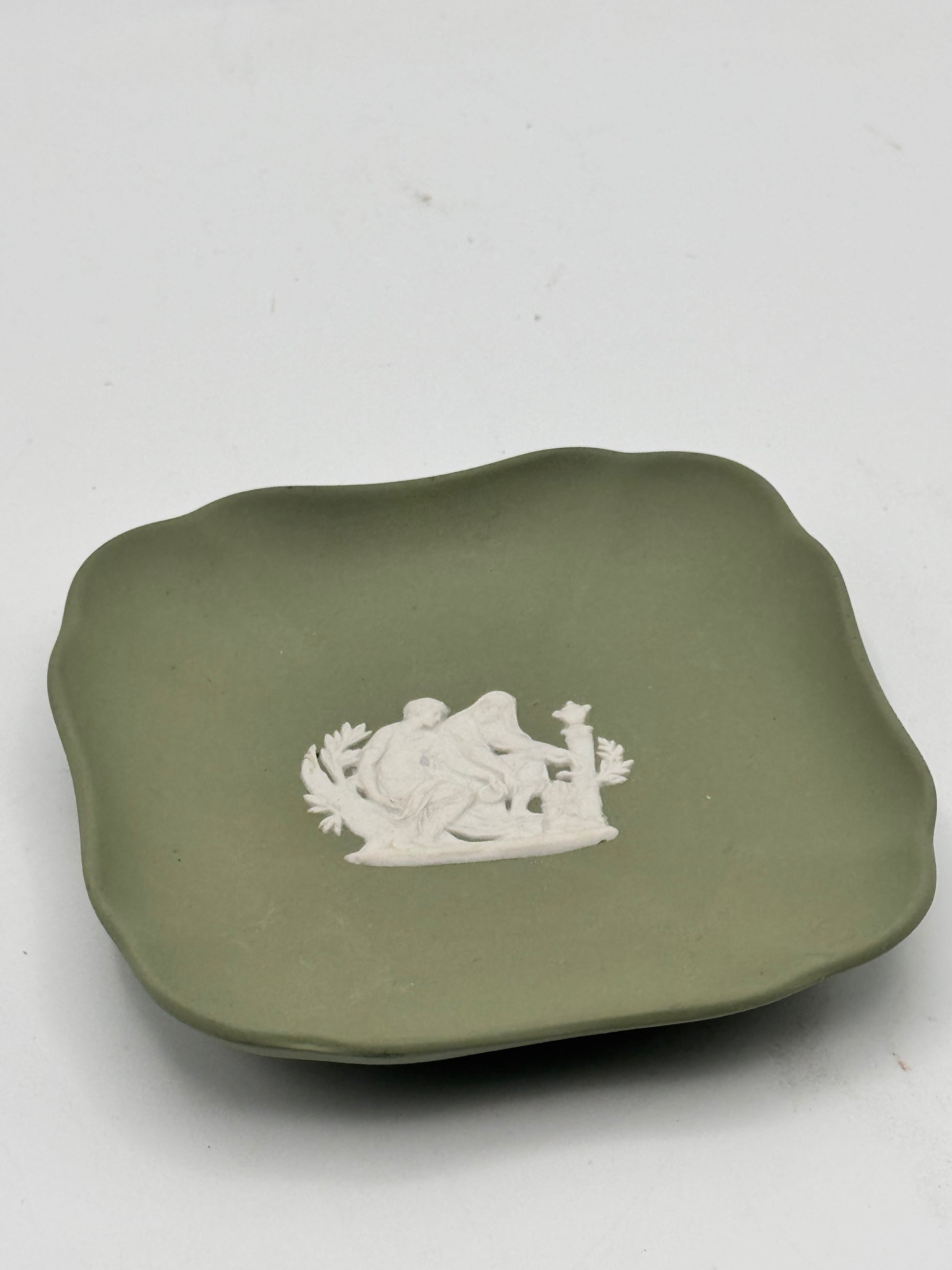 A charming Wedgwood Jasperware trinket dish in a soft olive green, produced in England in 1960. The center is decorated with a crisp white neoclassical relief scene of two classical figures beside a ceremonial flame, giving this petite dish the timeless look of an English country house accent.