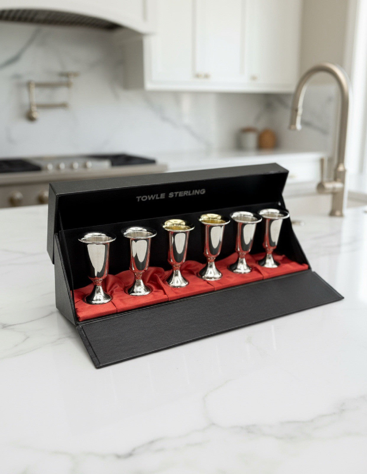 Elegant boxed set of six sterling silver cordials, perfect for entertaining or display. Four are marked Towle Sterling, and two are marked Web Sterling, each with the maker’s hallmark on the base.