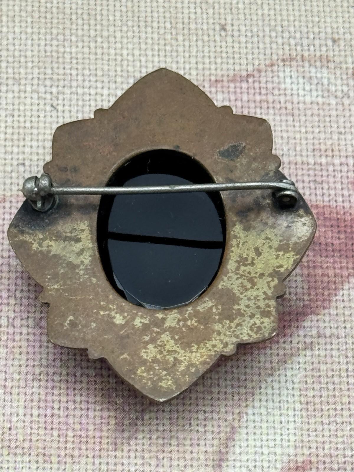 Antique Cameo Brooch Black Glass Original Frame Art Deco Style 1.57” x 1.38”