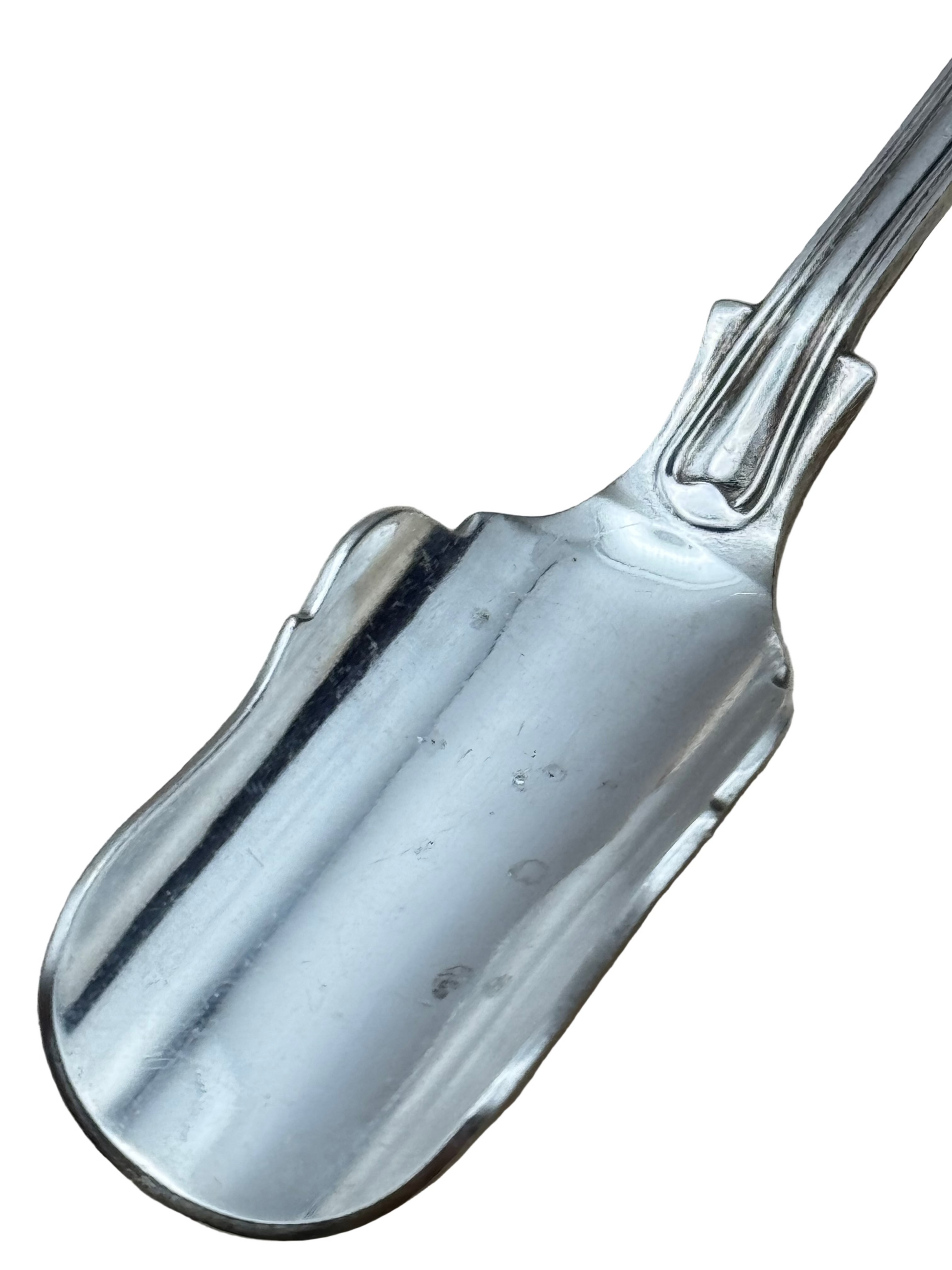 Elegant antique silver Stilton cheese scoop measuring approximately 8 inches long, featuring a beautiful shell and scroll handle pattern. This specialized serving piece was designed for scooping crumbly blue cheeses—especially classic English Stilton—and adds an unmistakably old money touch to any cheese board or formal table setting.