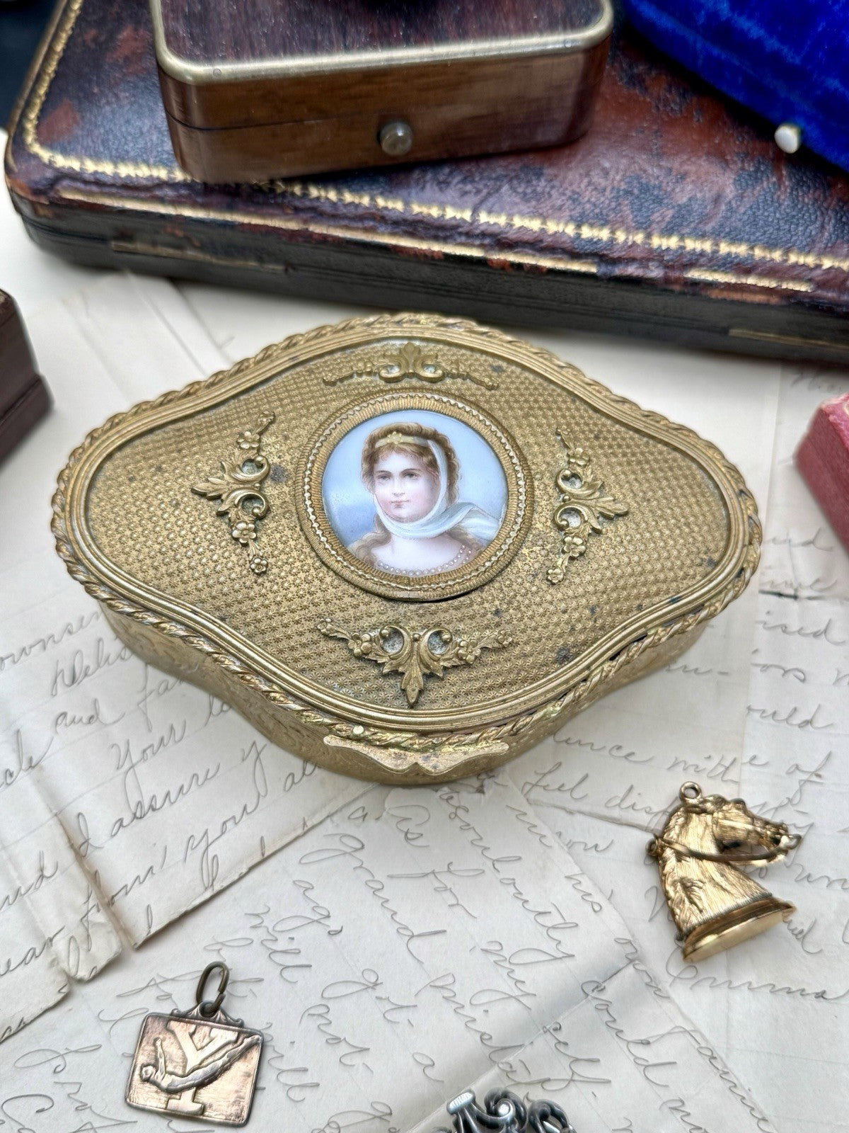 Antique French Style Porcelain Trinket Jewelry Box Painted Portrait Queen Louise