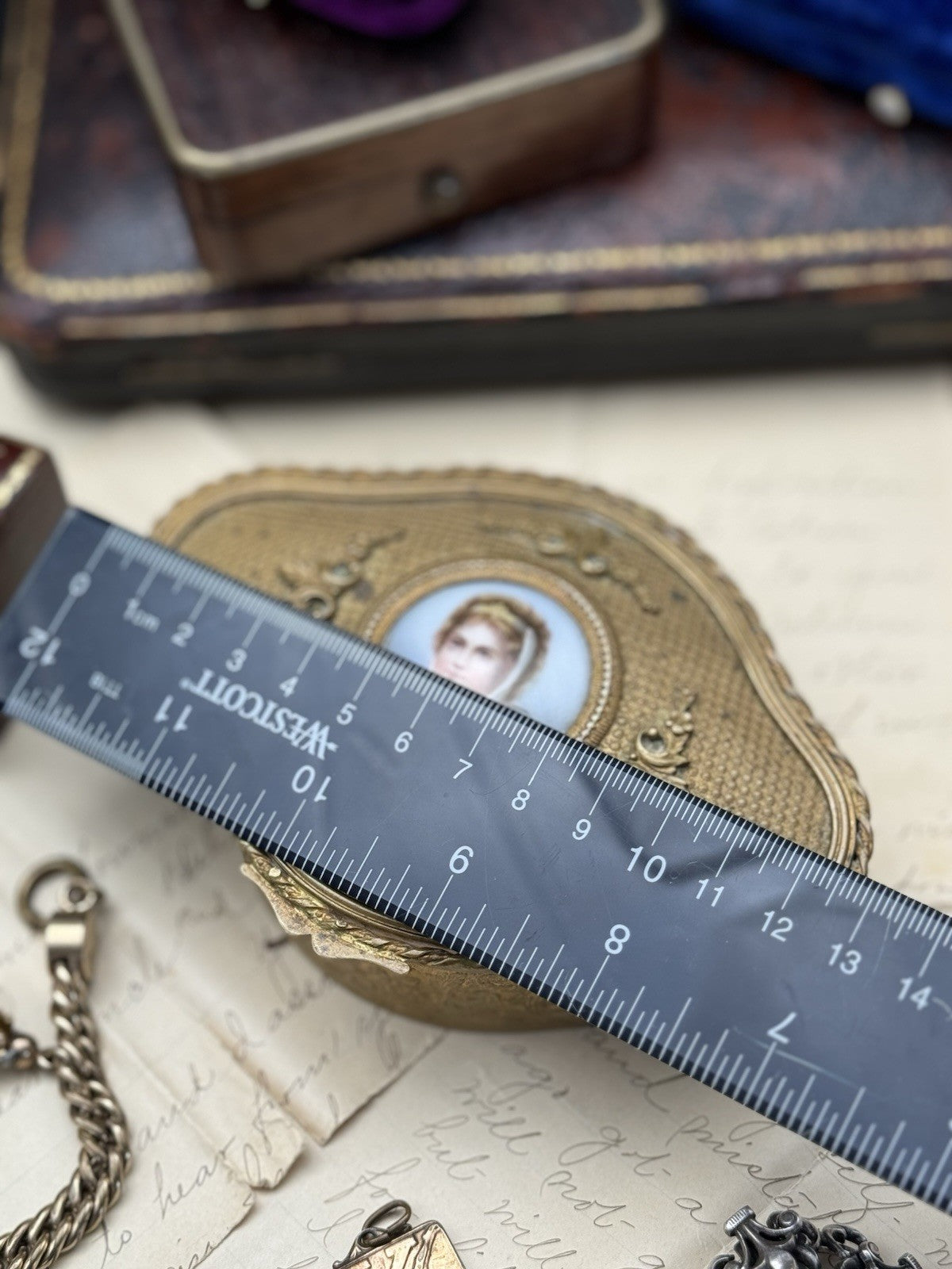 The lid showcases a delicately painted portrait of Queen Louise, framed by a rich color palette and fine detailing. The box is finished with a traditional hinged lid and gold-toned metal mounts—reminiscent of French ormolu-style accents. The interior is original with old green velvet and clean, ready for display or use. Some wear, discoloration, is evident. The velvet has come loose in areas!