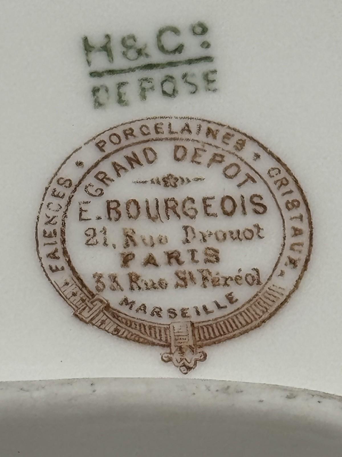 The underside is impressed H&C Depose (Haviland & Co., Limoges) and carries the retailer mark for E. Bourgeois, Grand Dépôt, Paris and Marseille, a noted purveyor of fine porcelain and crystal to the French elite.