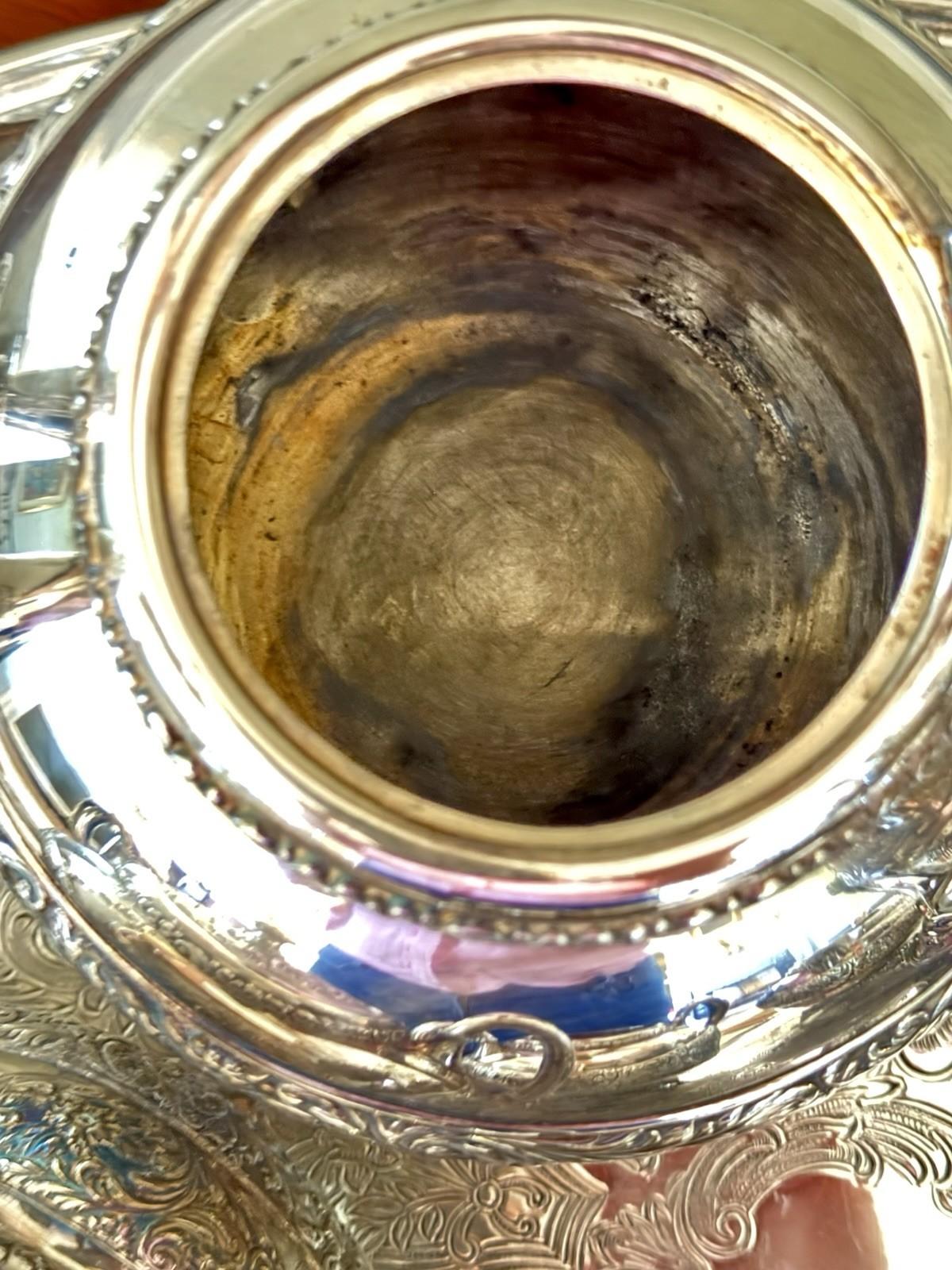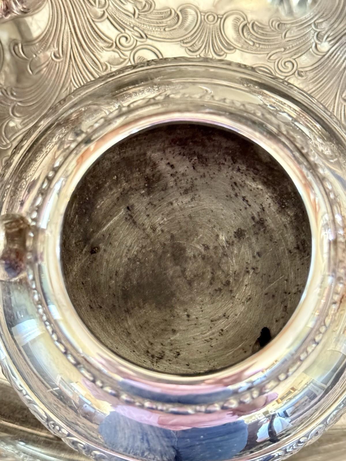 Displays beautifully with brilliant exterior silver luster and crisp detailing. Interior discoloration and surface wear consistent with age and use. Tray is not original but a lovely complement. Overall, a striking and well-preserved set that embodies the grandeur of late Victorian tea service.