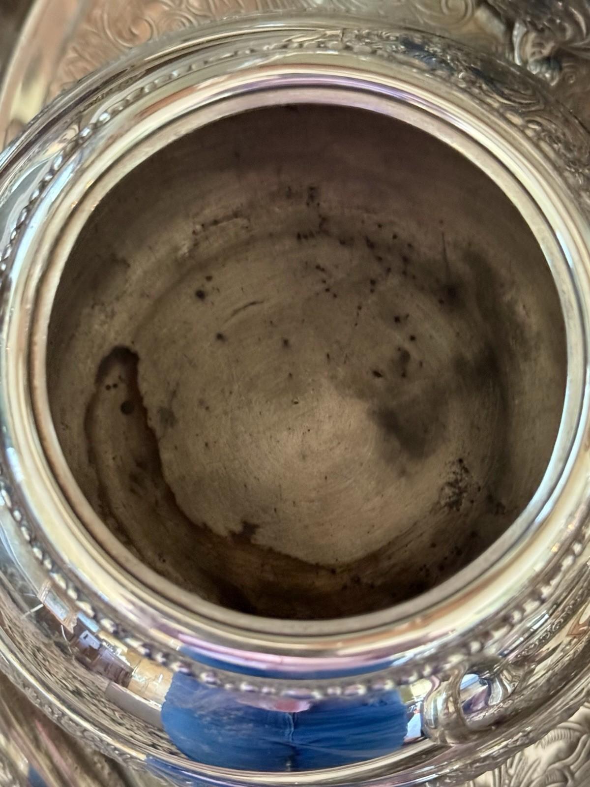 Each piece rests on ornate scrolled feet and features finely detailed repoussé work and decorative finials. The exterior silver finish is exceptionally bright and well preserved, showing no significant loss or dents.