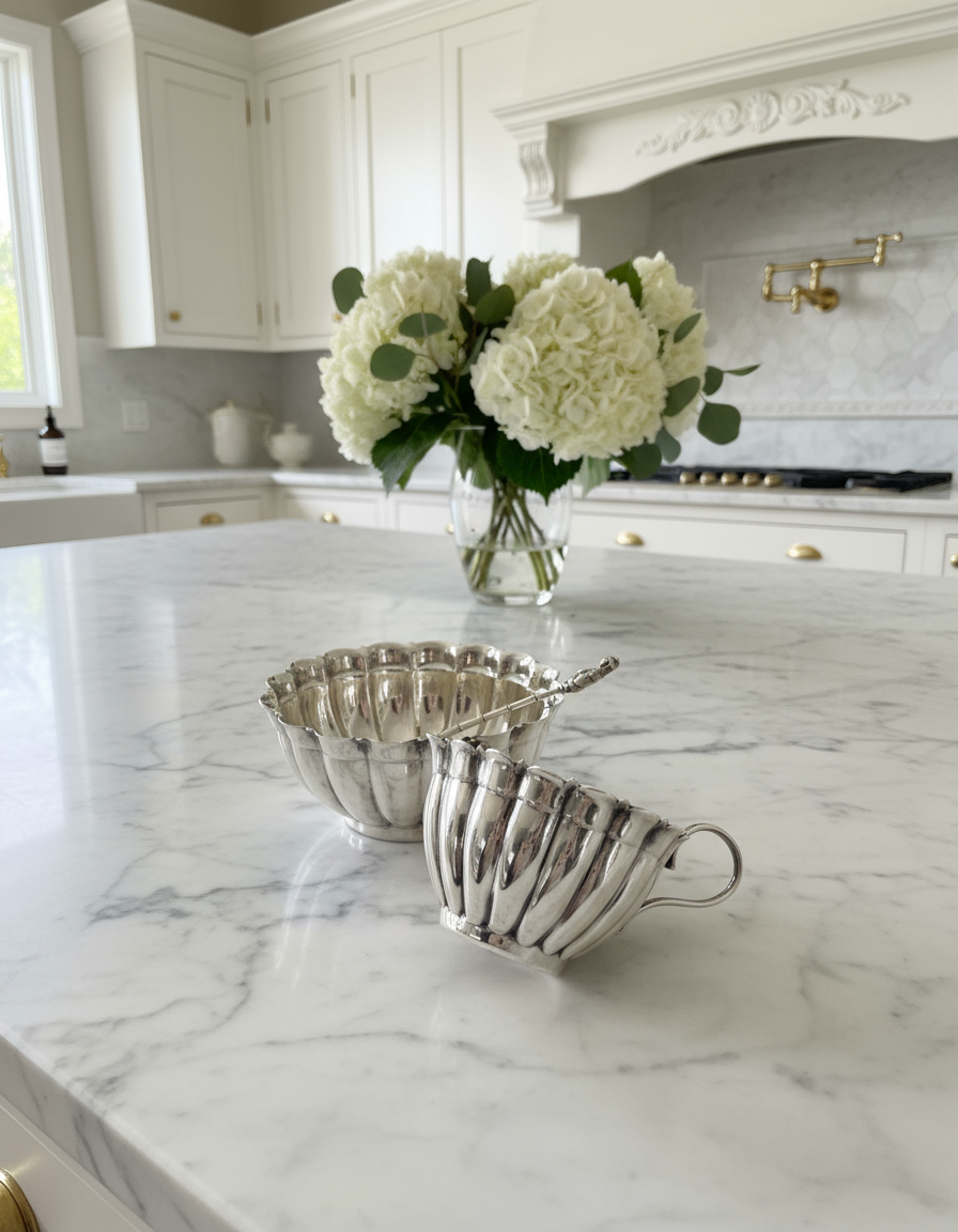 A finely crafted antique silver plated creamer and sugar set, presented in its original fitted presentation box. Both pieces feature a scalloped, fluted design with bright reflective surfaces and elegant shaping. The set is marked ESPN and remains in beautiful condition.
