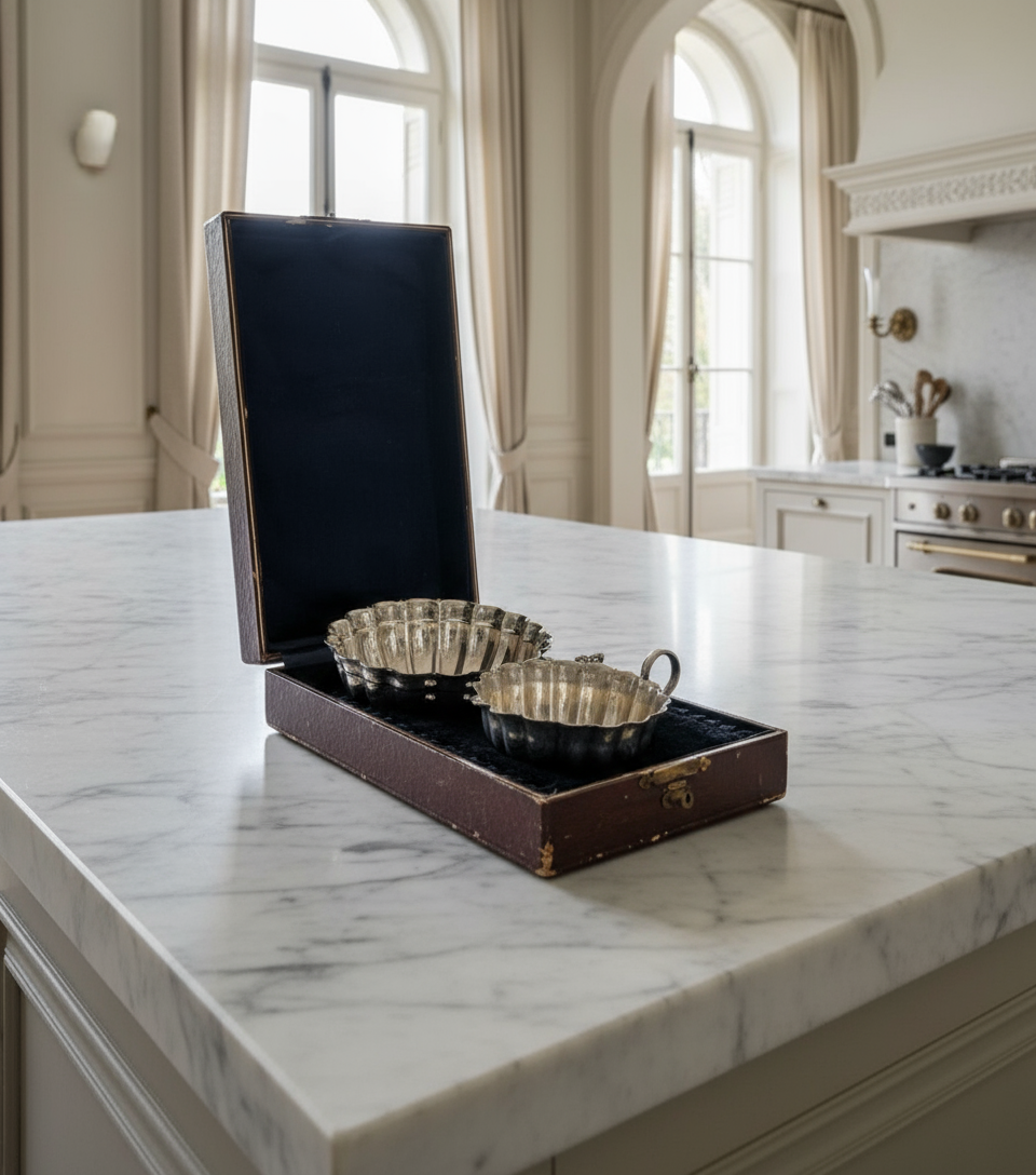 The fitted case is lined with dark velvet and satin, providing a striking contrast to the bright silver plating. All measurements are approximate.