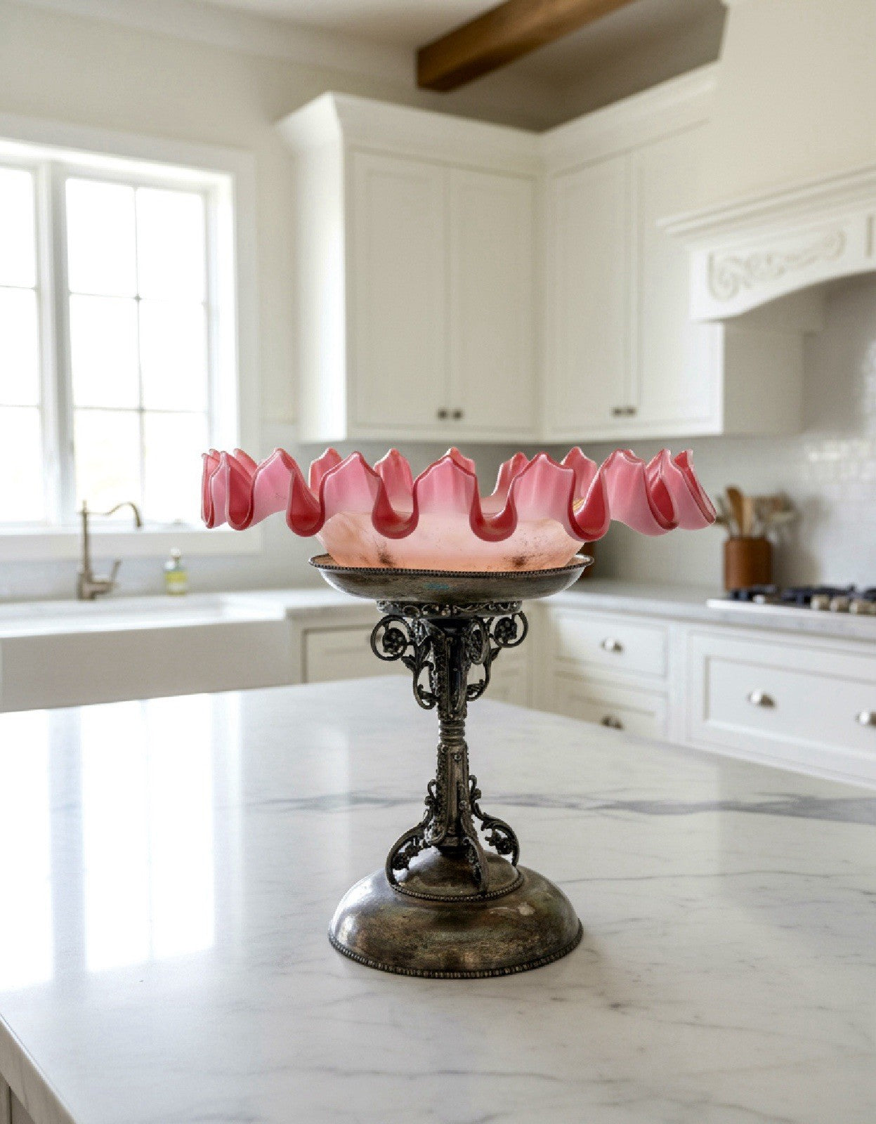 Antique Victorian Compote Satin Glass Ruffled Edge Silverplate Stand, 11” POOL