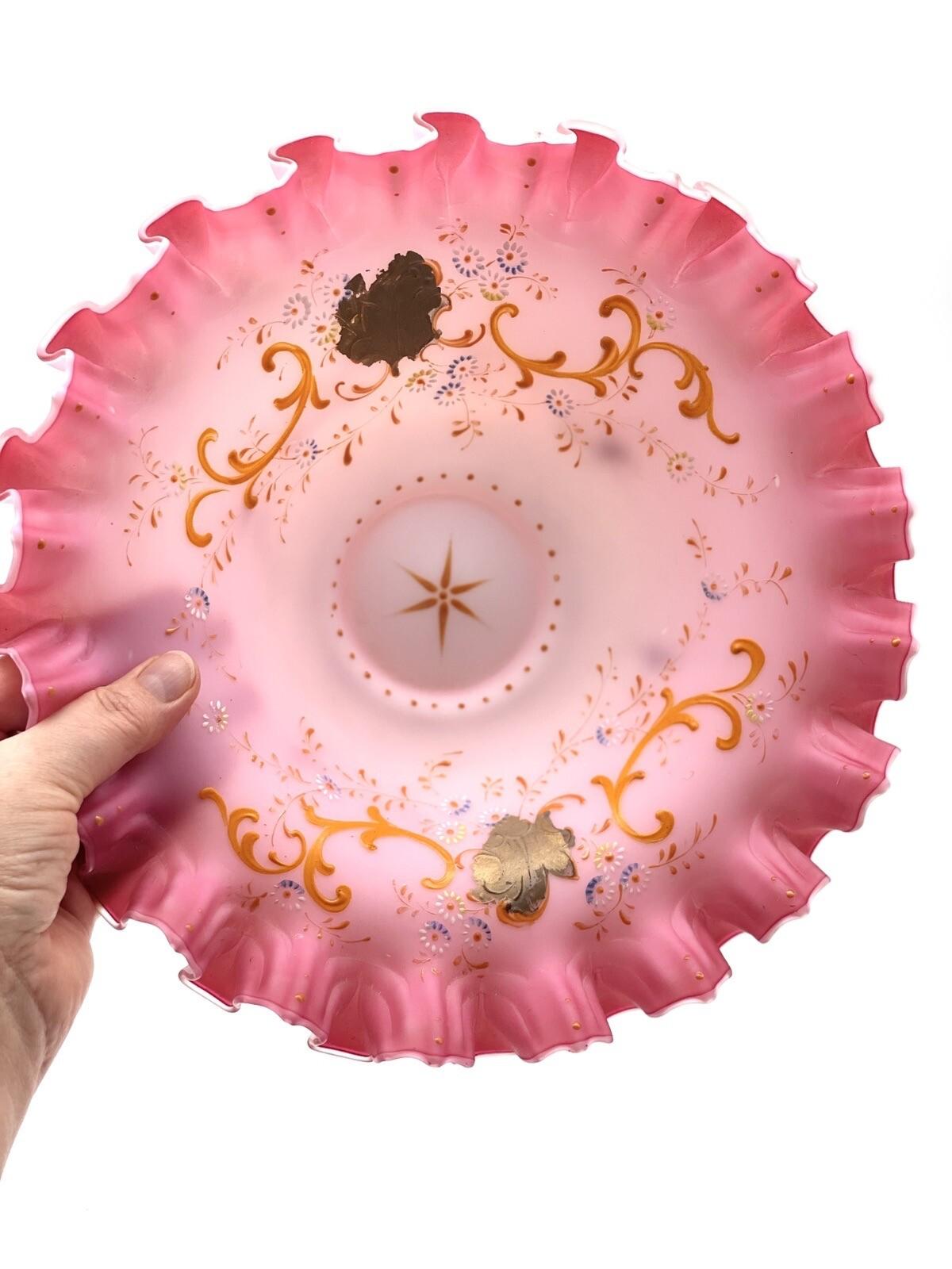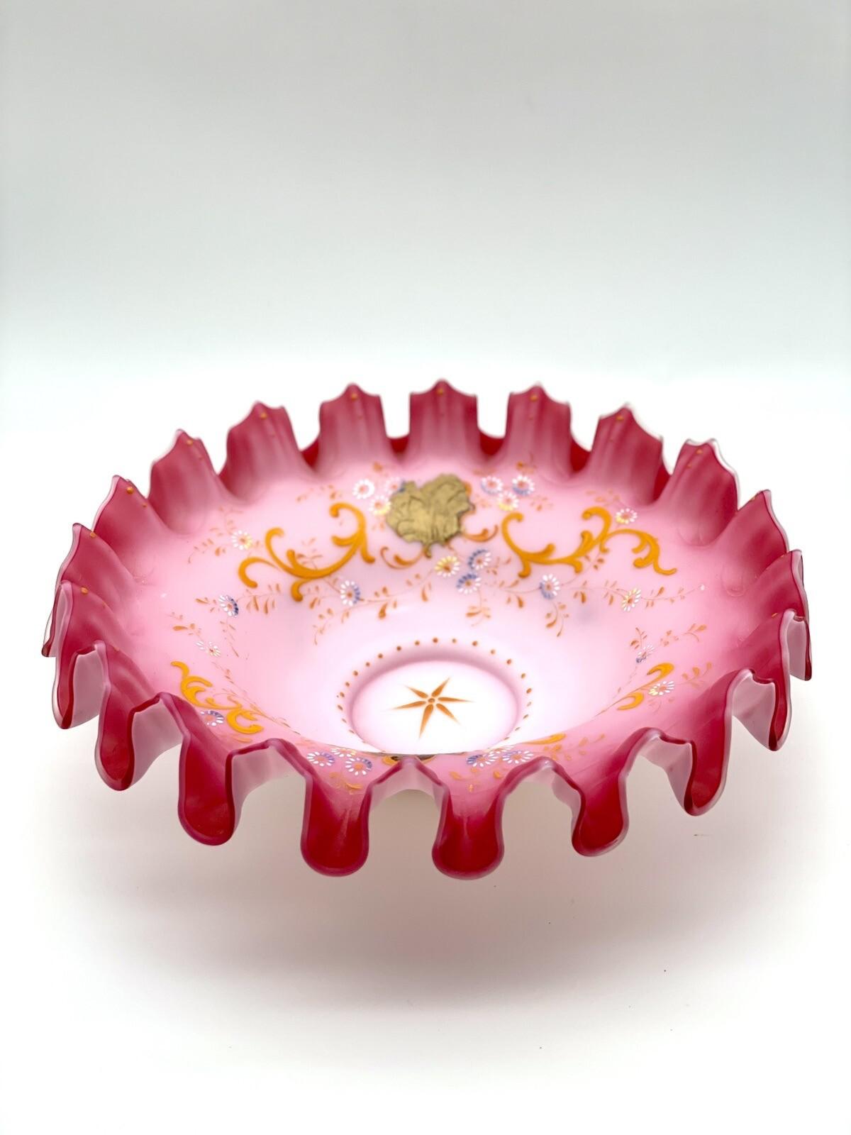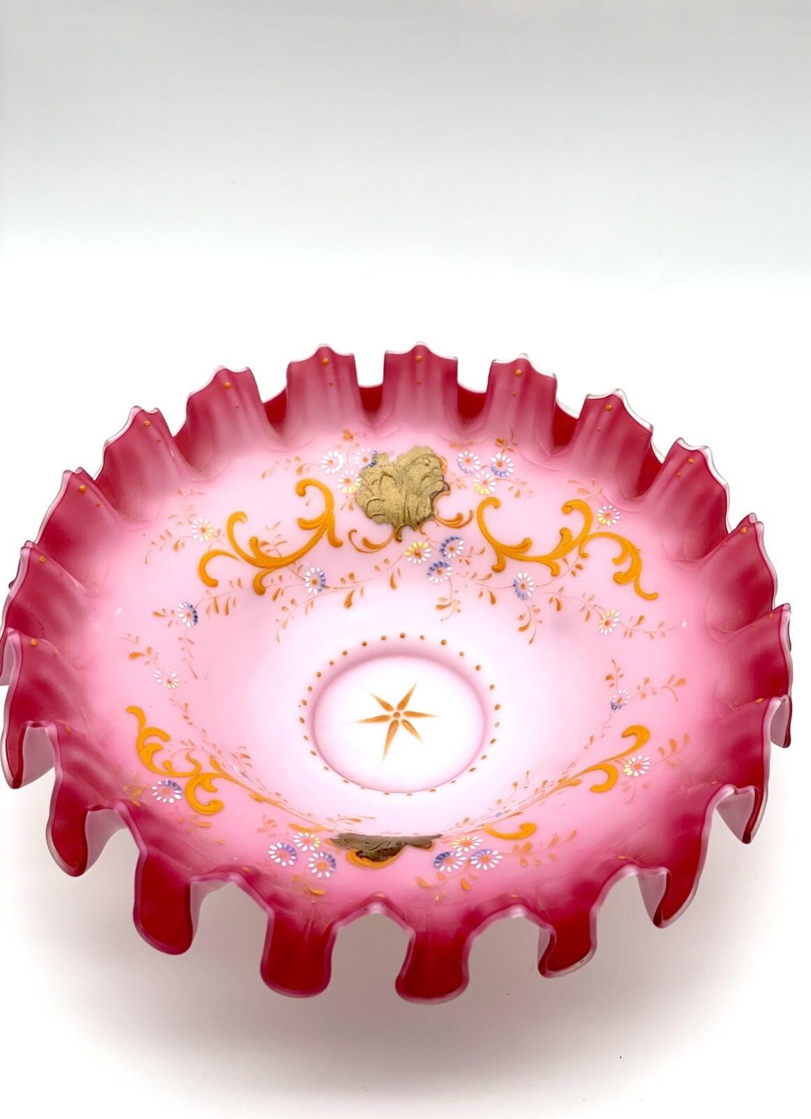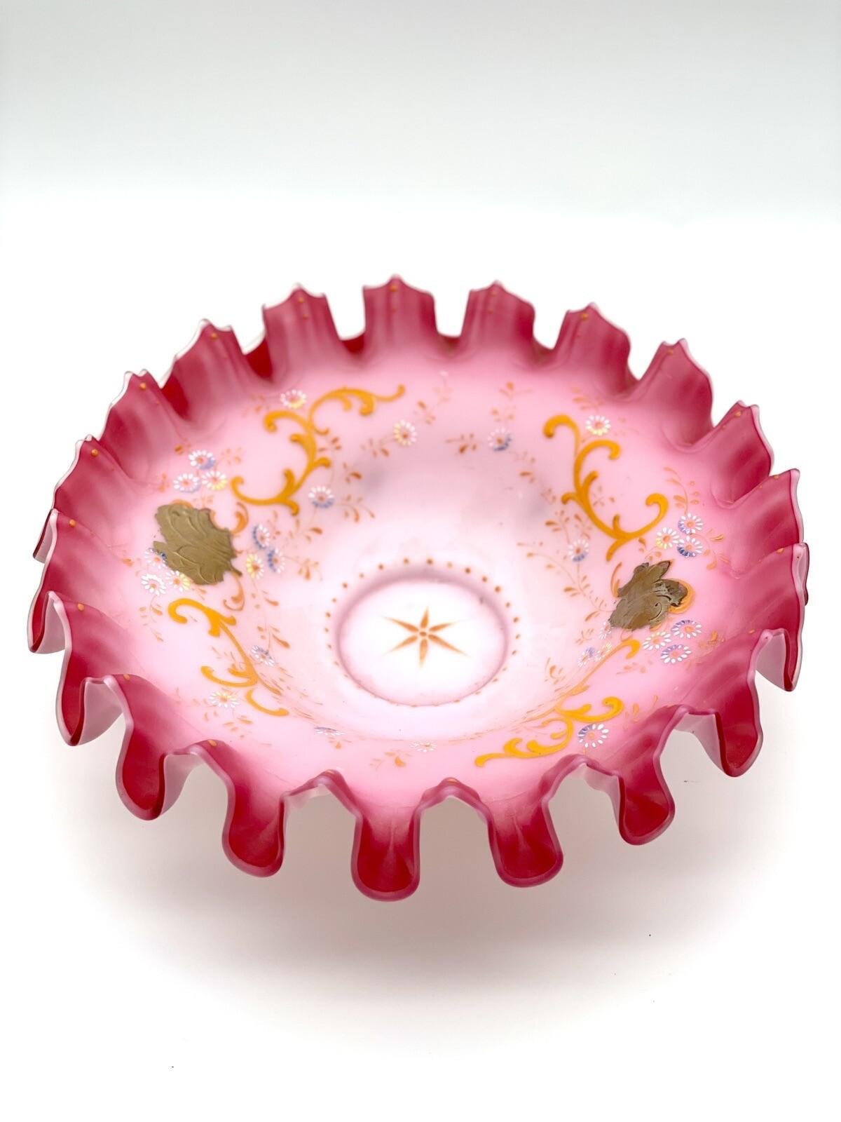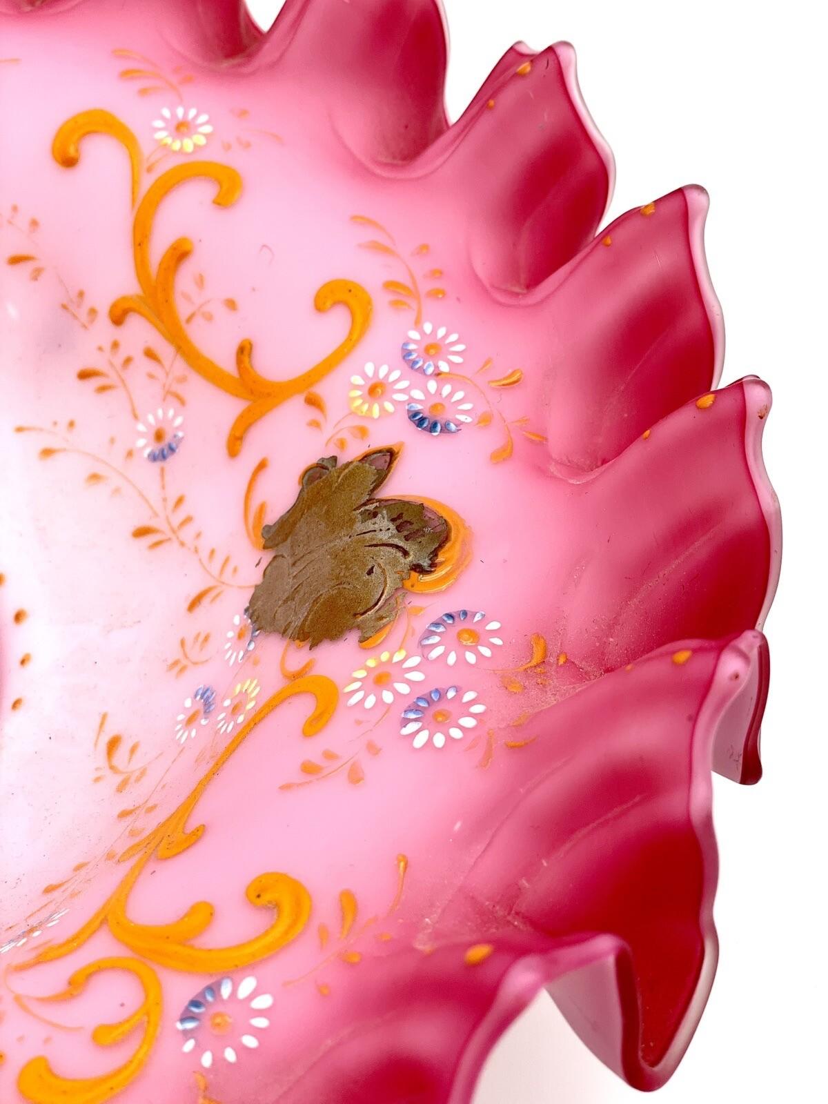 A striking Victorian era satin glass compote, featuring a vivid pink-to-white ruffled glass bowl with hand-painted enamel floral and gilt decoration. The bowl is adorned with delicate daisy motifs and scrolls, along with a central starburst design.