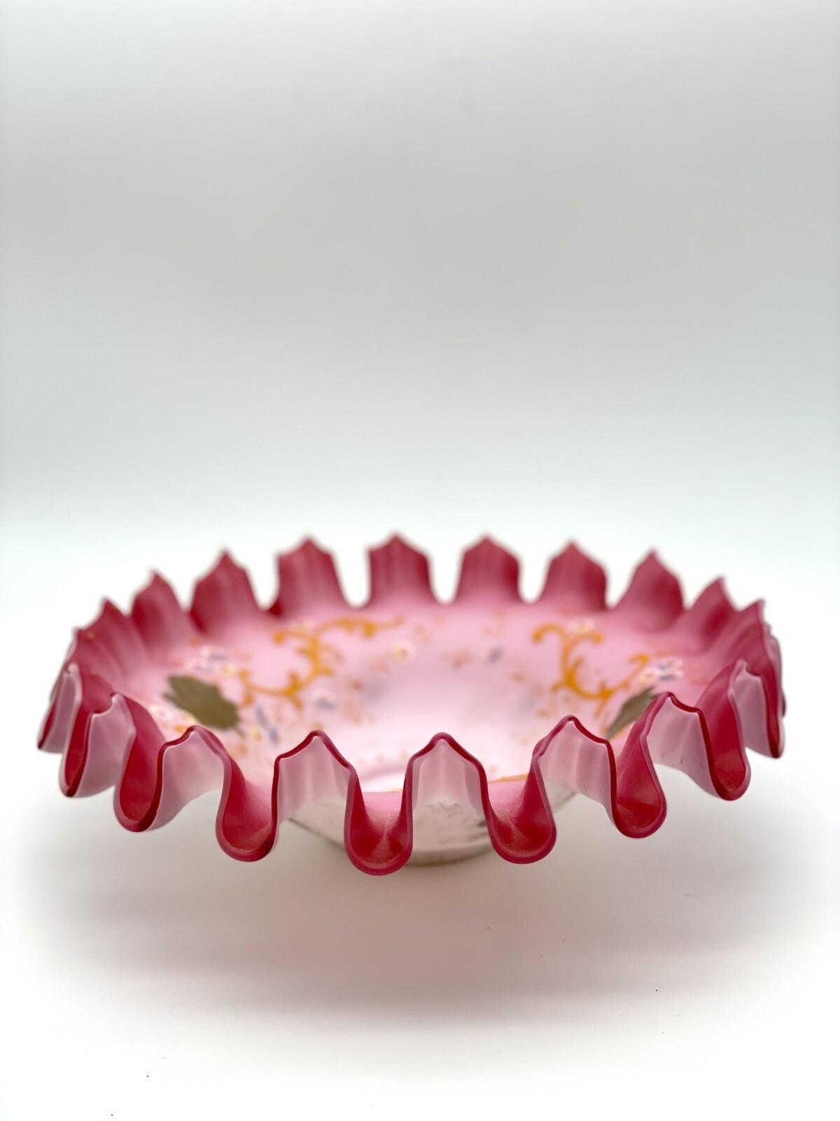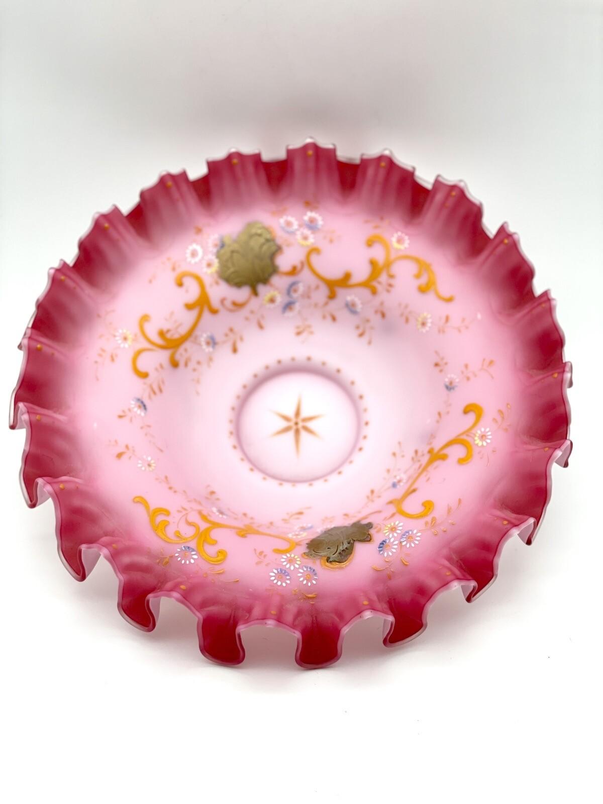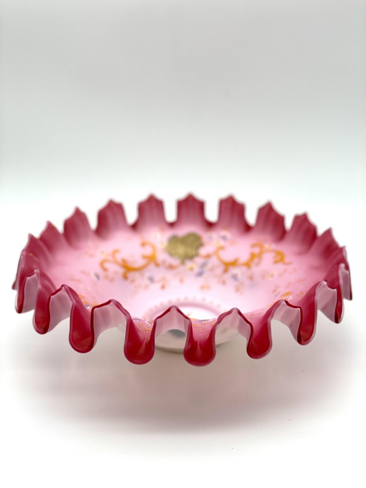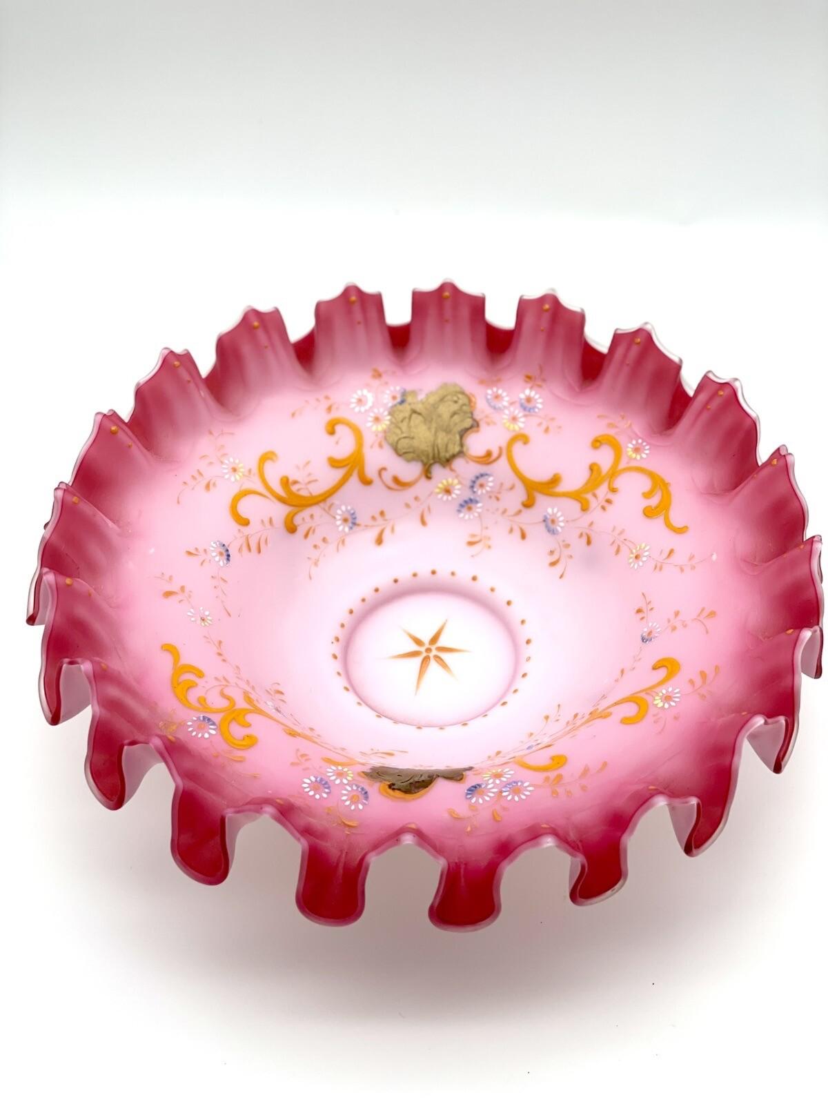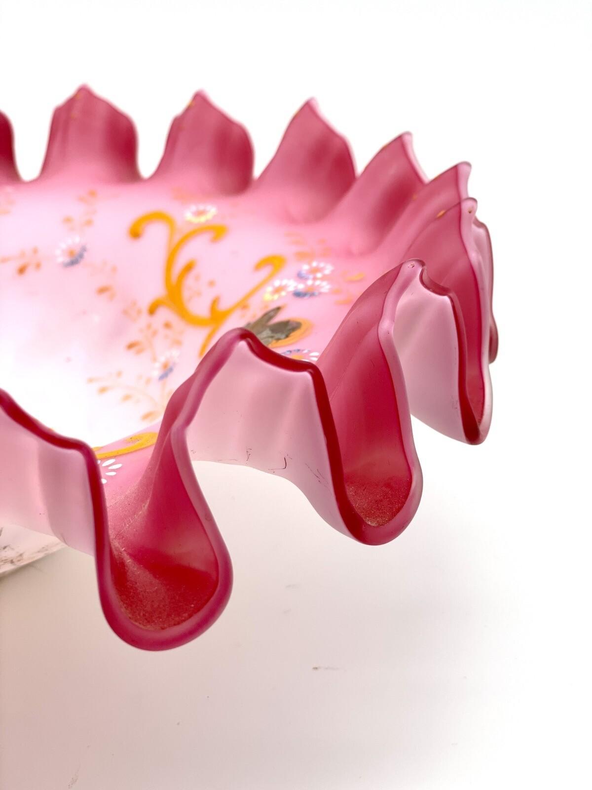 A striking Victorian era satin glass compote, featuring a vivid pink-to-white ruffled glass bowl with hand-painted enamel floral and gilt decoration. The bowl is adorned with delicate daisy motifs and scrolls, along with a central starburst design.
