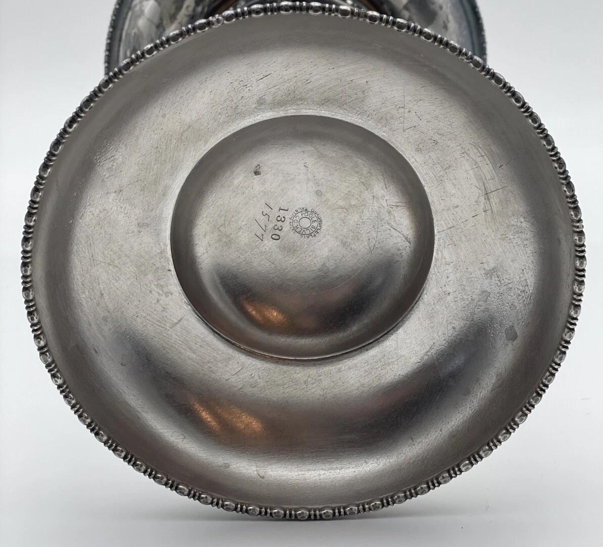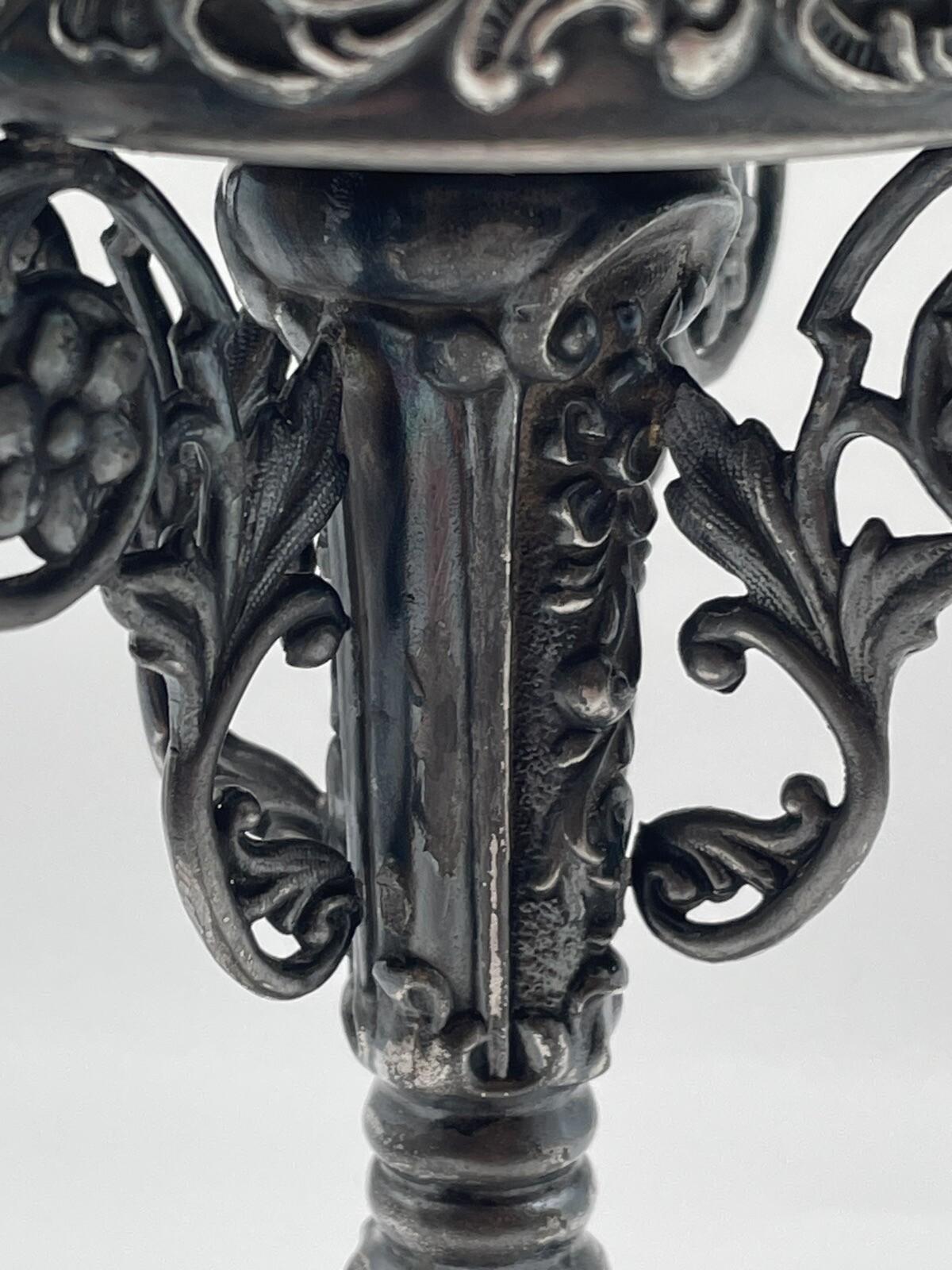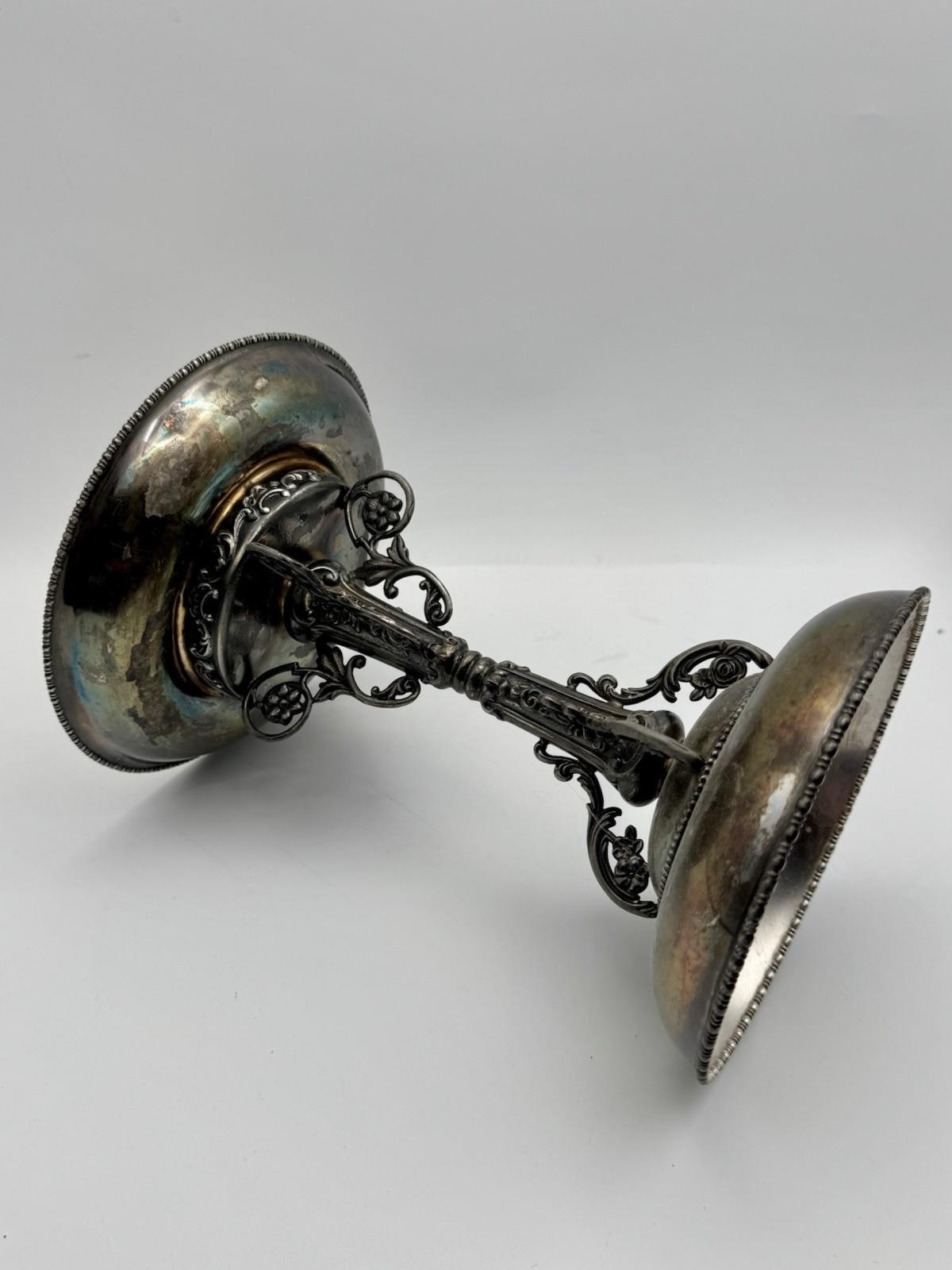 The glass rests securely in an ornate silverplate stand with scrolling details and an elegant raised base, making this a true statement centerpiece.