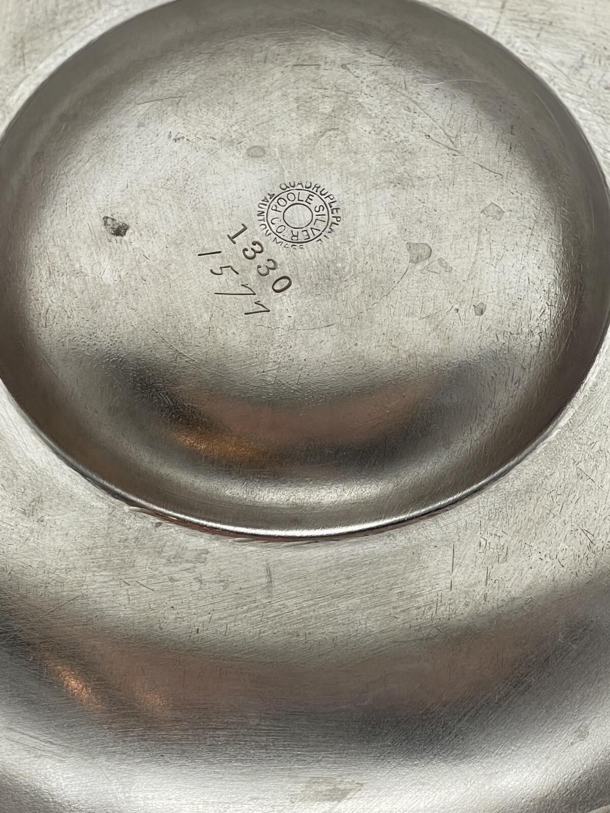 Good vintage condition with mild signs of age-appropriate use. Some plate loss and minor hairline cracks in the silverplate stand. Dark scratch marks underneath the glass bowl.