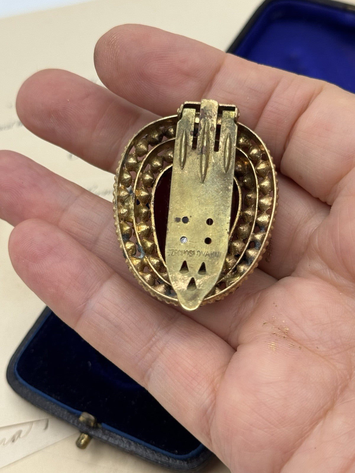 This beautiful Art Deco Czech glass dress clip dates to the 1920s–1930s and captures the glamour of the era. It features a large deep red faceted glass stone at the center, surrounded by two rows of smaller red glass stones, all set in a gilt brass frame. The piece was designed to imitate the rich look of Bohemian garnets, a style highly fashionable during the Art Deco period.