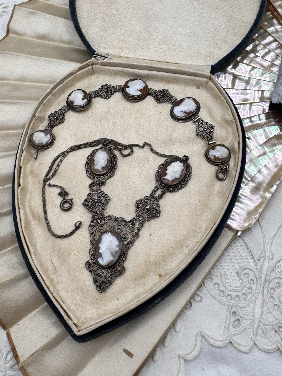 Vintage condition with age-appropriate wear. Natural patina and darkening to the 800 silver consistent with age. Filigree remains dimensional and detailed. Cameos appear secure and intact. Please examine photographs carefully for surface wear consistent with antique and vintage jewelry.