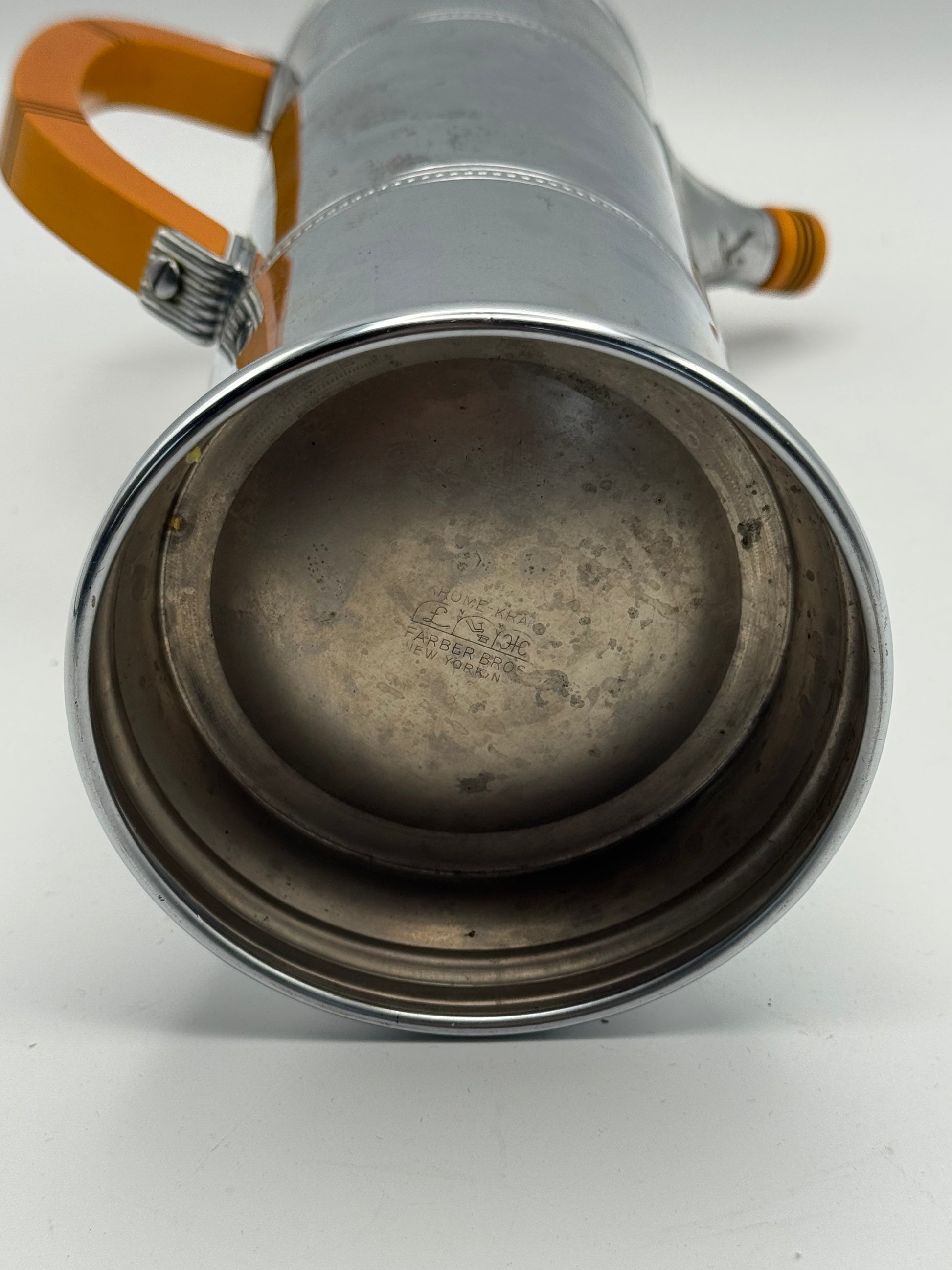 Krome Kraft / Farber Bros. are prized for their sleek Art Deco styling and bold Bakelite accents. This cocktail shaker embodies the glamour of 1930s entertaining and remains highly desirable among collectors today.
