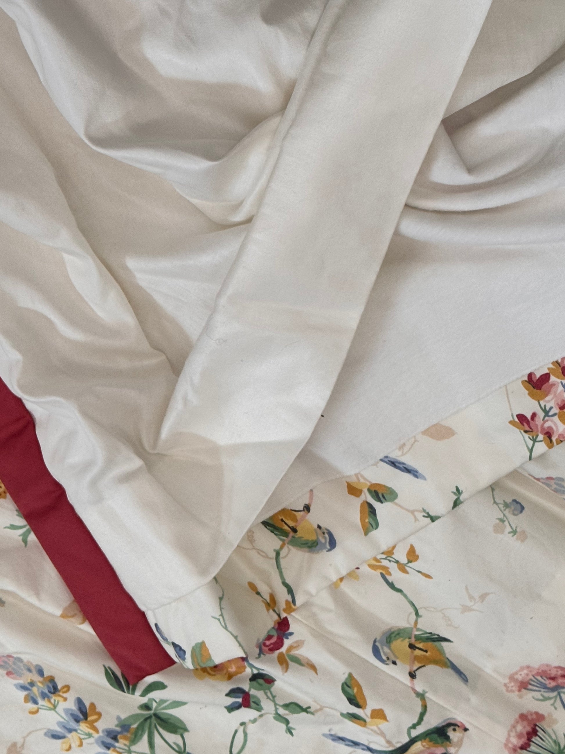 Based on the pattern, scale, and colorway, the fabric is believed to be Schumacher’s Chickadee Floral in the “Sky” colorway. No selvage is present, so this attribution is not verified, but the design is a very close visual match to the well-known Schumacher pattern.